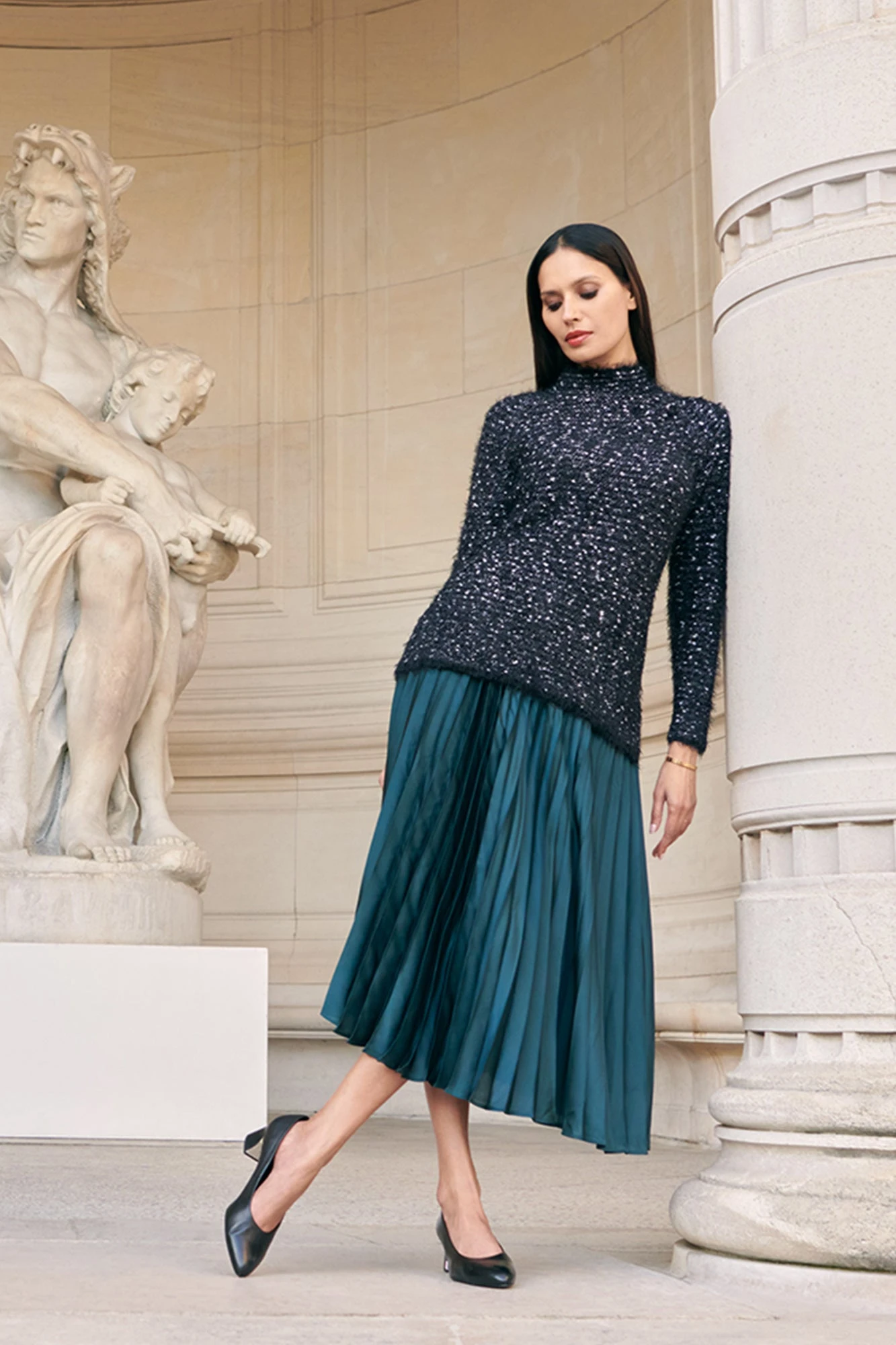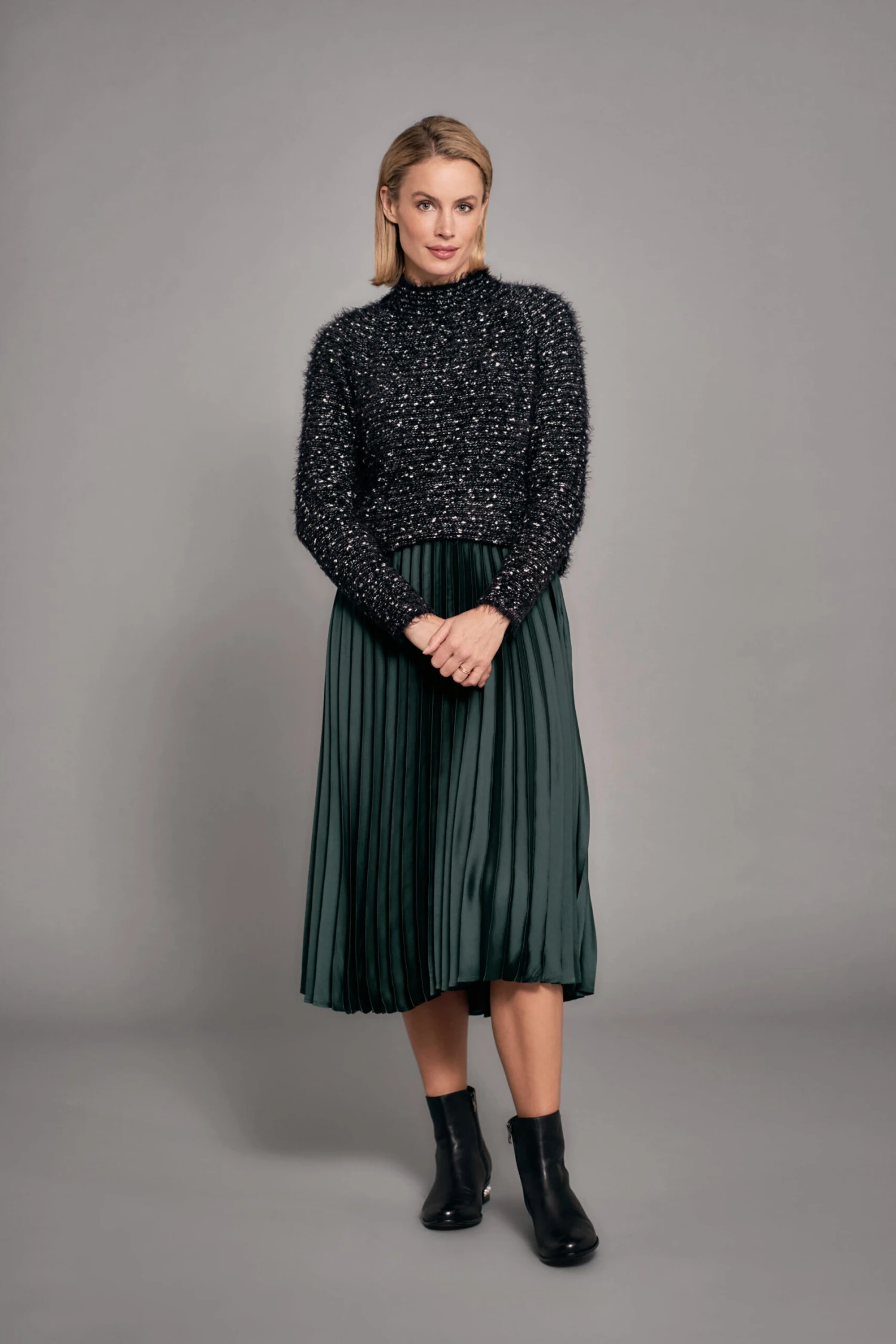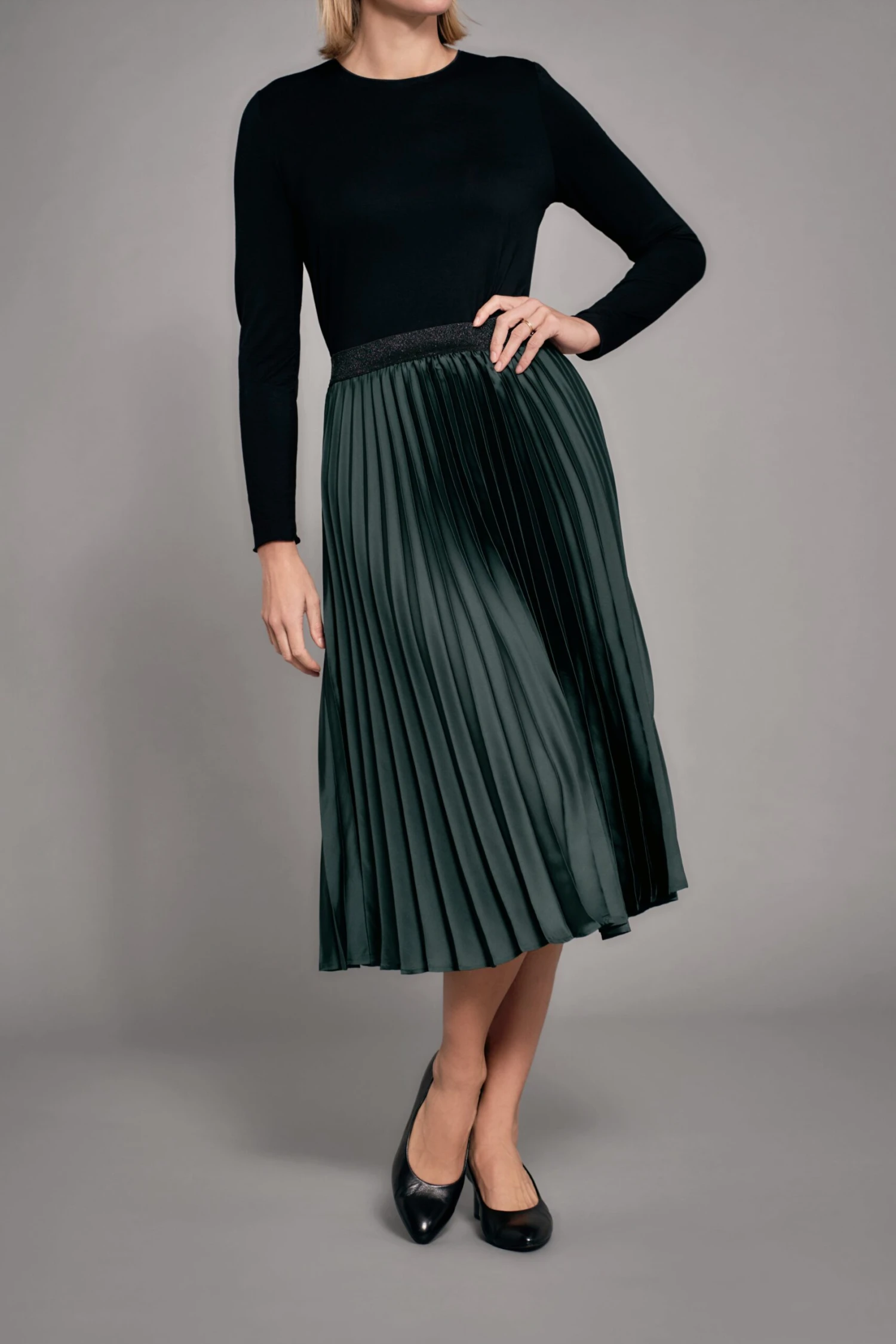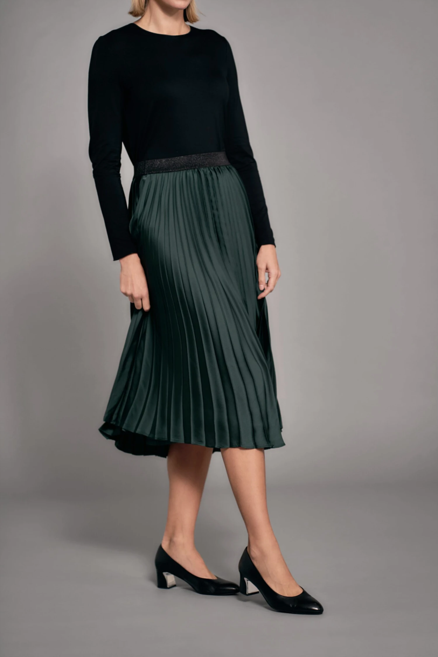 A must-have of the latest collection, meet our elegant, midi-length pleated skirt. Showcasing a rich forest green shade, the skirt features an elasticated shimmer waistband and is fully lined for added comfort and warmth. Dress it up with elegant accessories like our Lola Silver Heel Court shoe and Baroque Pearl Necklace.