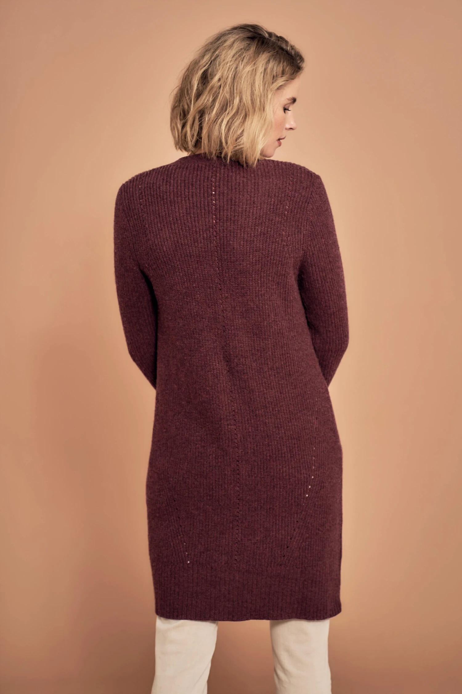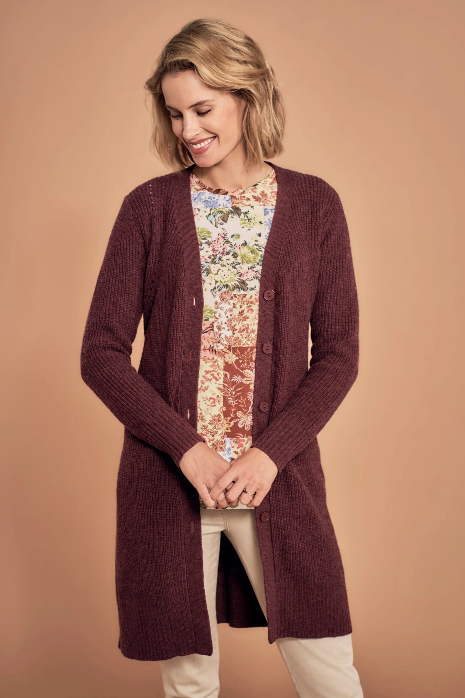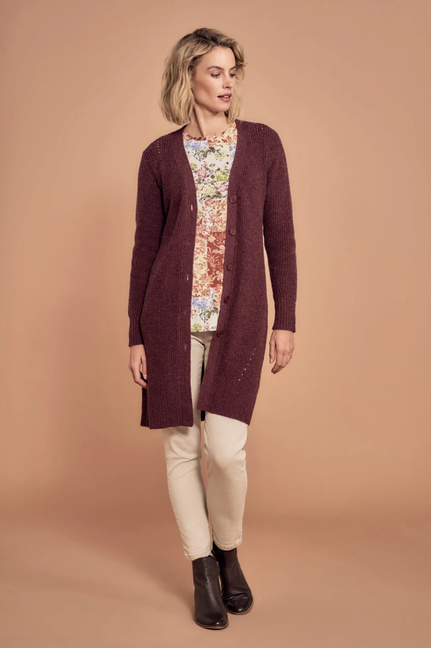 Get winter-ready in our ultra-soft, long line cardigan. With lovely pointelle detail and crafted from Australian Merino wool, this cardigan has a beautiful blend of burgundy and chocolate-coloured tones. Layer up over our Pierre Print Top and signature Bengajean®, bien sûr!