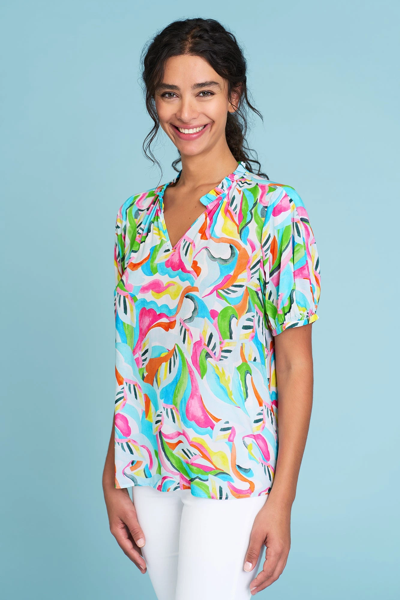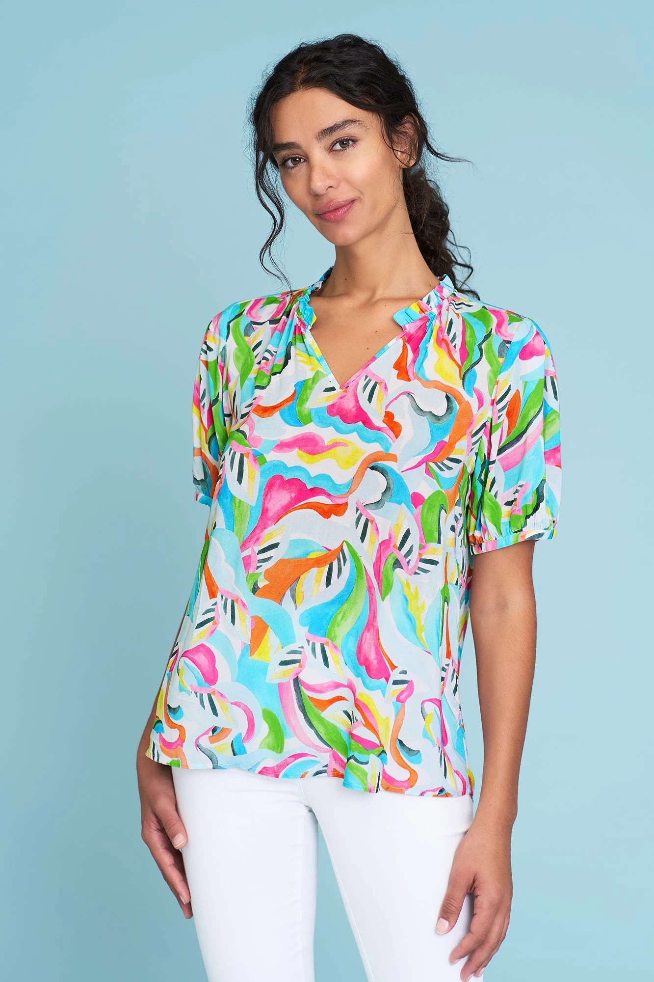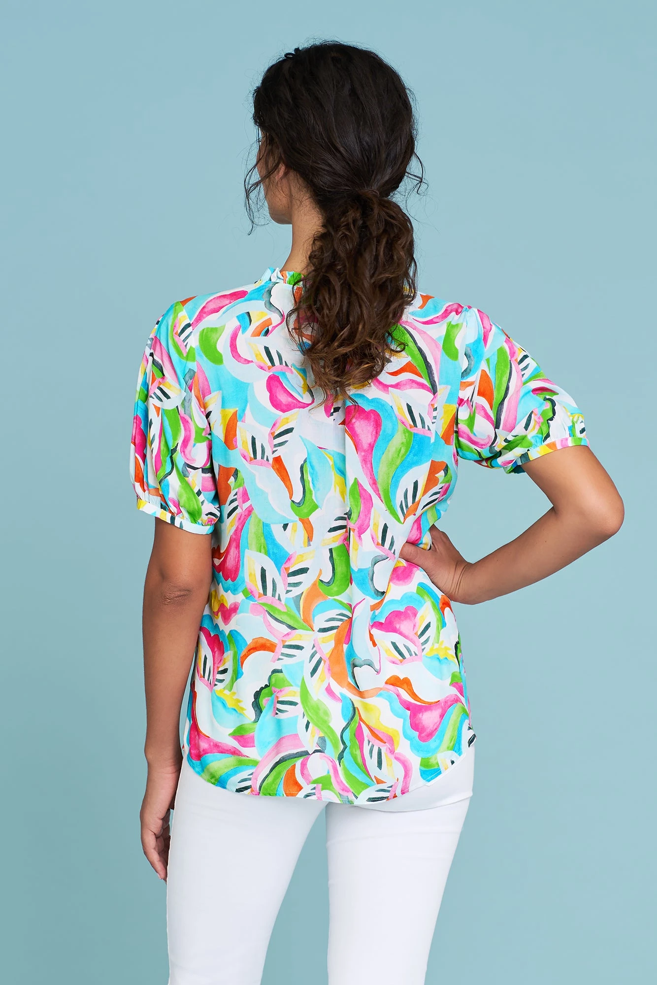 Showcasing our Abstract Multi print, this lightweight Printed Frill Neck Blouse is a fun fusion of colour and play. Crafted from LENZING™ ECOVERO™ certified fibres, this 100% rayon blouse offers a notched neck with frill detail, puff sleeve and a comfortable relaxed fit. Team this blouse with our iconic Bengajean® in White and accessorise with our Harli Cross Strap and Pêche Drop Earrings.
