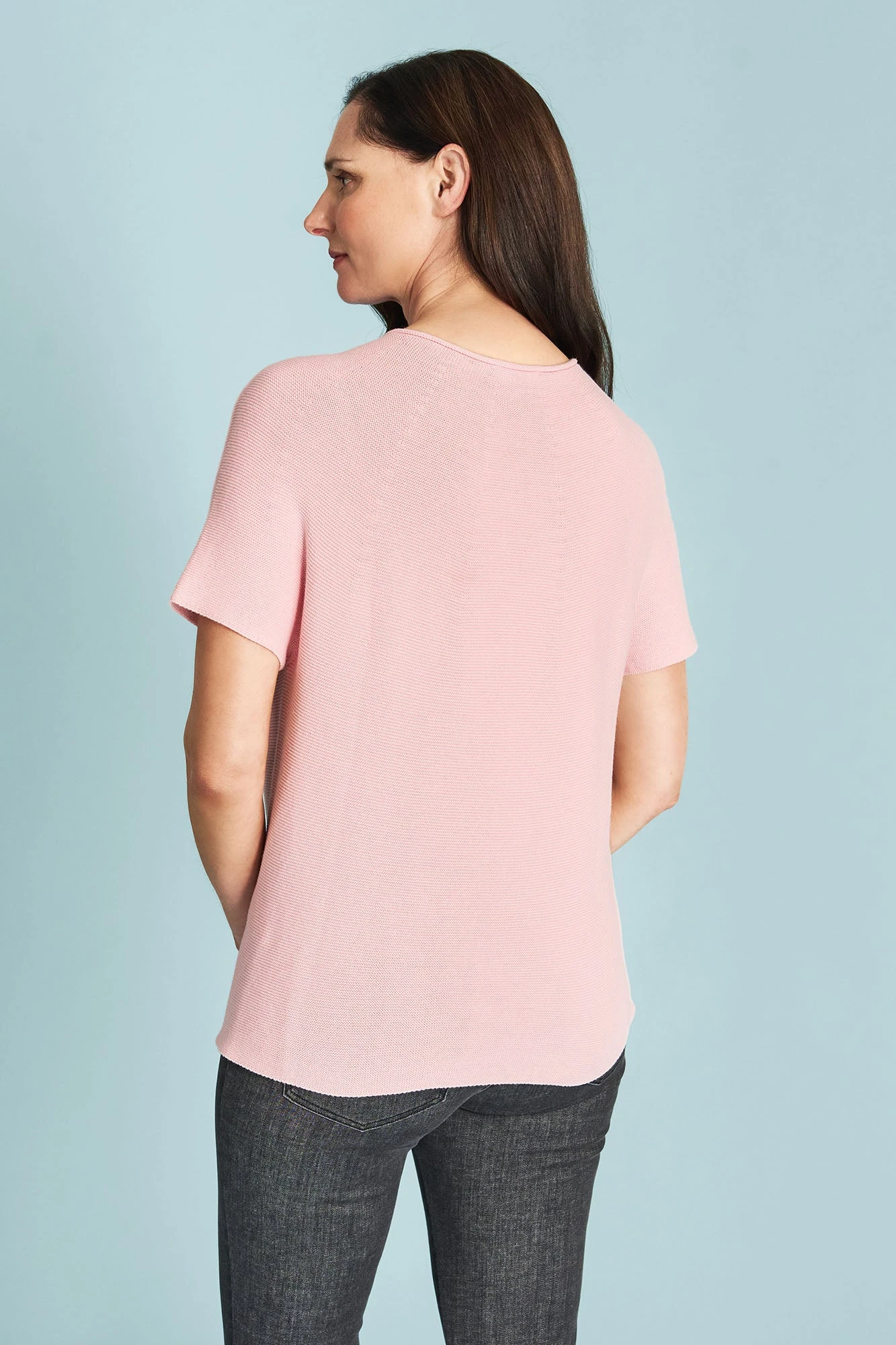 The Purl Cotton Knit is a sweet pop of colour. It offers the soft-hand feel of a knit with the comfort and ease of a short sleeve top. It also features a shorter length, making it perfect for pairing with an elegant midi or maxi-length skirt.