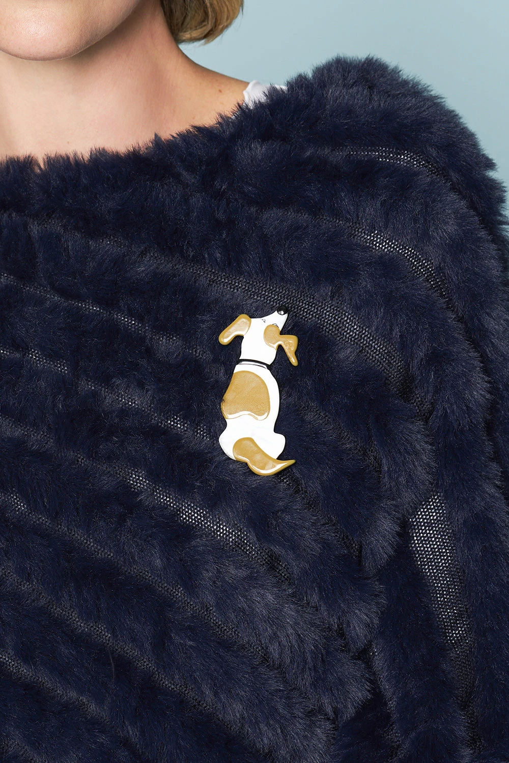 Dog lovers unite! Introducing our cute Resin Dog Brooch featuring Mustard accents and a pearlised White base. Secure this four-legged friend to your favori winter jacket or coat for a truly ‘paw-some’ look.