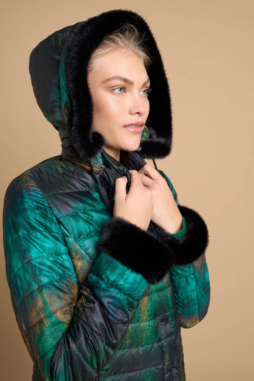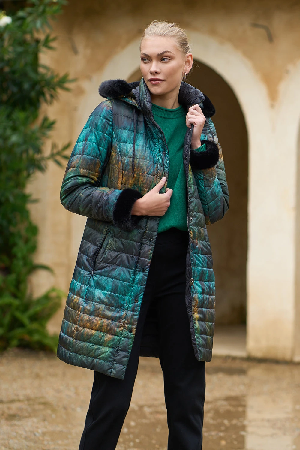 This Reversible Longline Puffer is not only versatile but incredibly warm and cosy with feather and down wadding. Crafted from recycled materials and featuring a hood and faux fur trims that are all detachable, wear it your way! Opt for the bold Bretagne print or plain Black side on show.