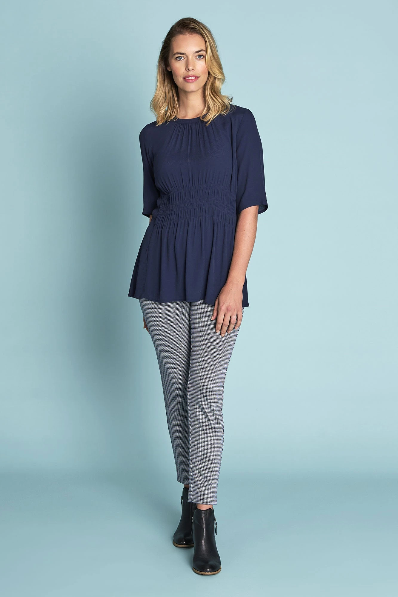 Every Francophile needs an elegant, ruched top in French Blue! Featuring an on-trend half sleeve, scoop neck and lovely gather details through the bodice, this top looks stunning when paired with our Jacquard Skinny Pant. Discover Rue Saint Honoré in style.