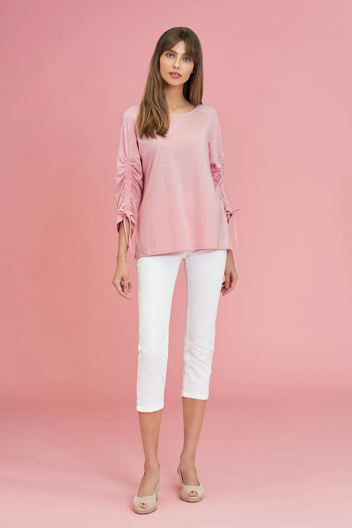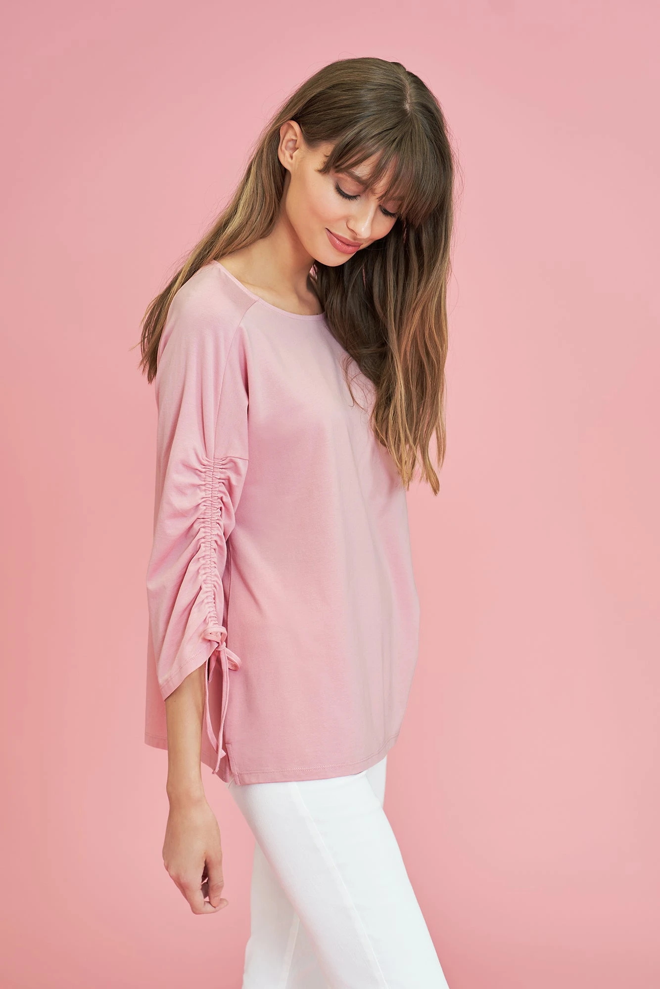 Comfort meets style in our Ruched Sleeve T-Shirt in gorgeous peony. Crafted from a comfortable cotton modal jersey, this t-shirt features whimsical ruching and a self-fabricated tie at the front of the ¾ sleeve. Add a pop of colour to your daily style.