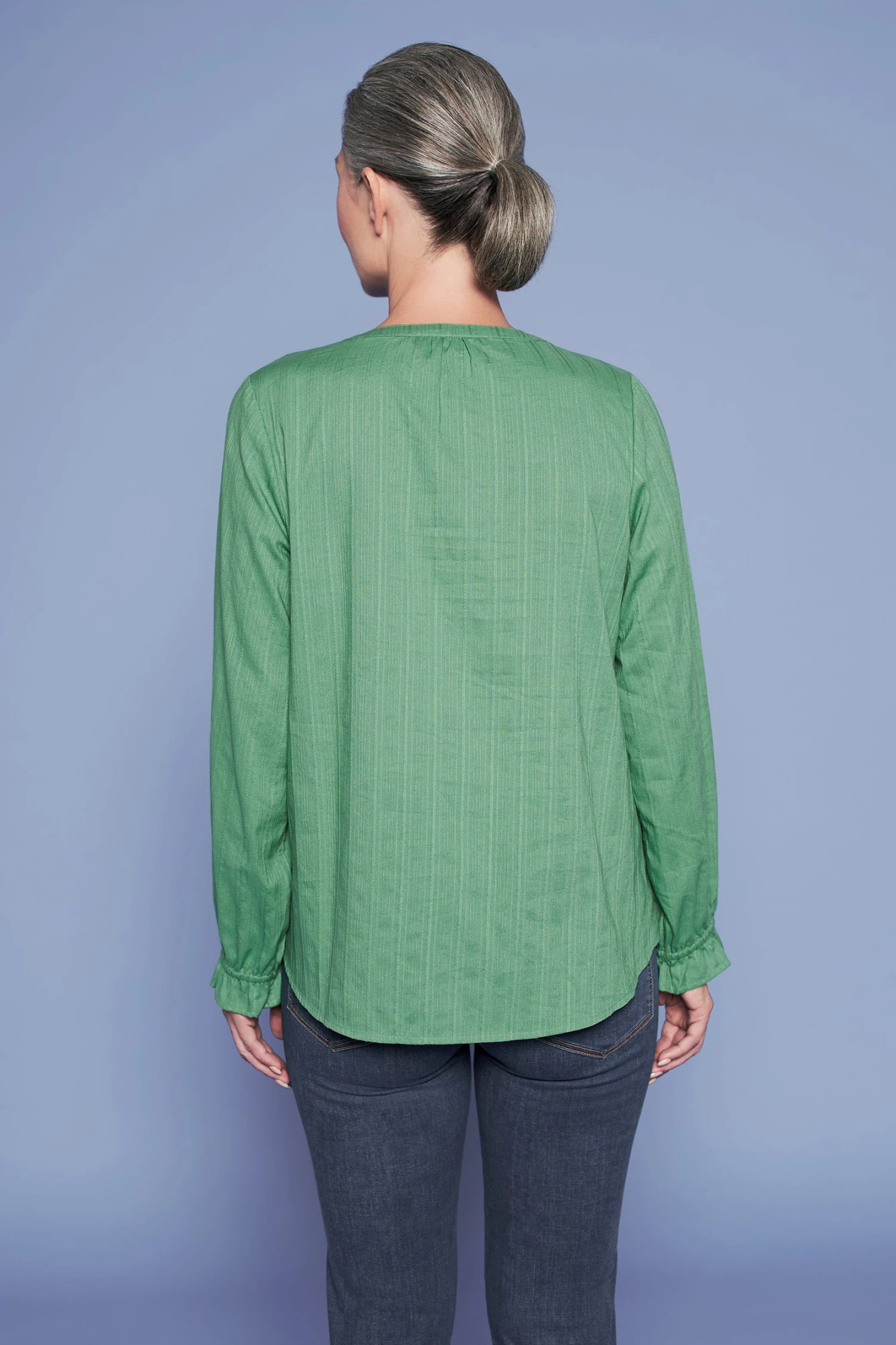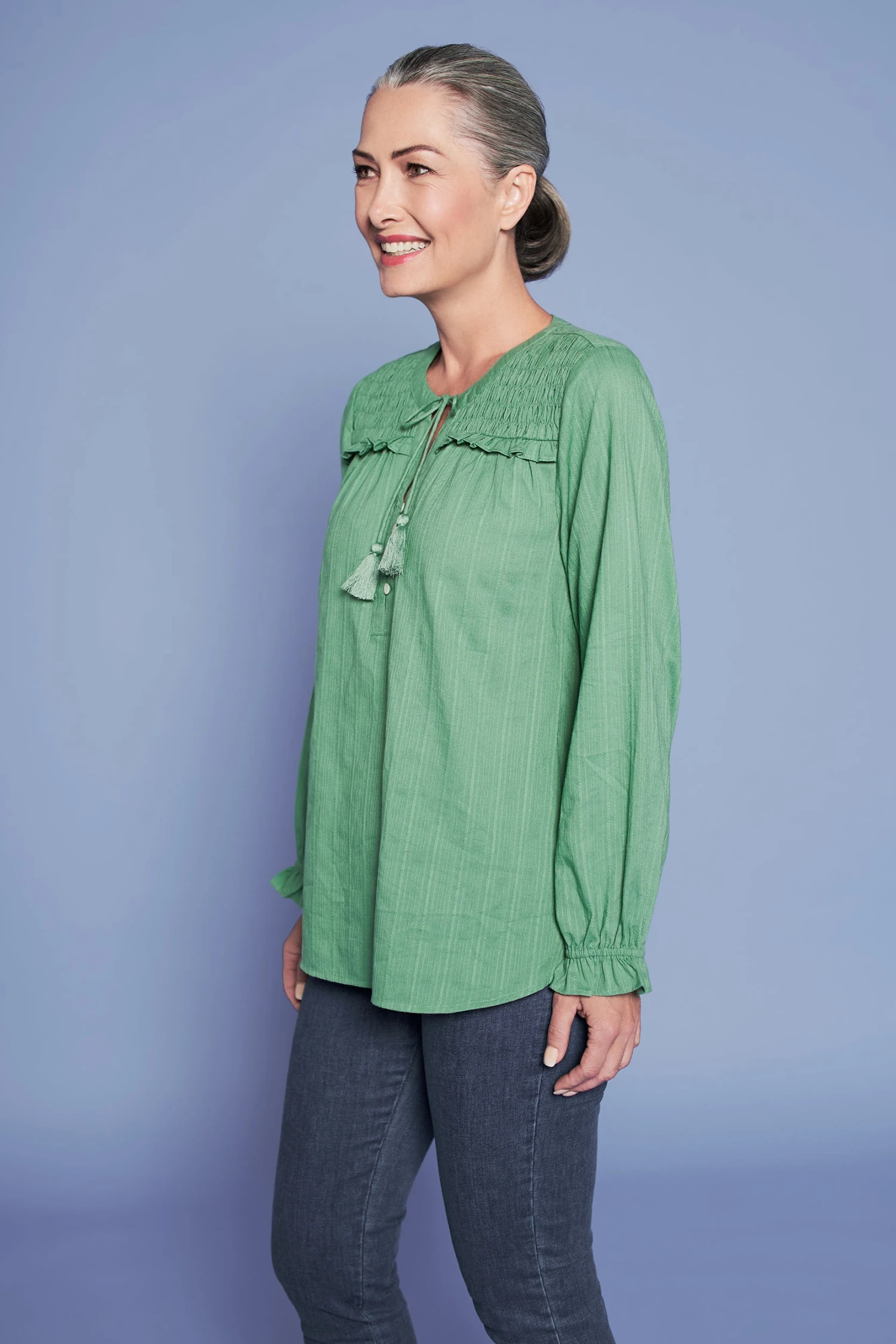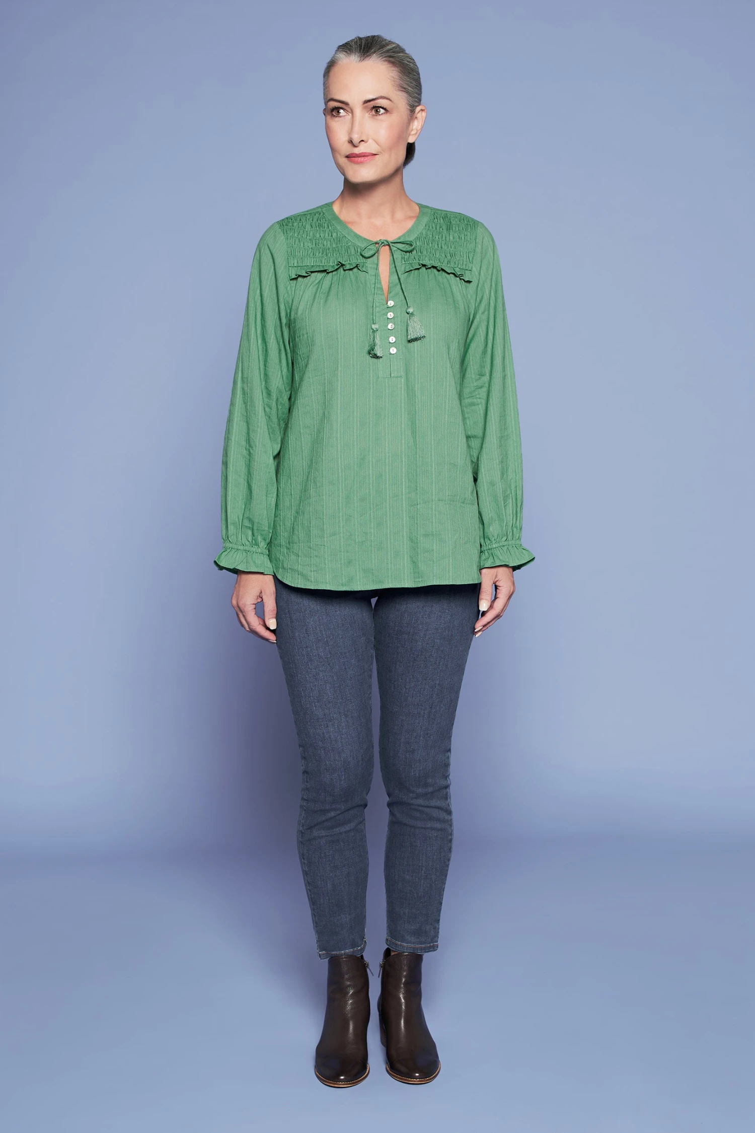 In a subtle forest colour, comes this feminine Shirred Cotton Blouse. Featuring whimsical tassel ties and shirred front yoke with frill detail, this is a lightweight and comfortable blouse that makes an elegant accompaniment to our must-have Bengajean®.