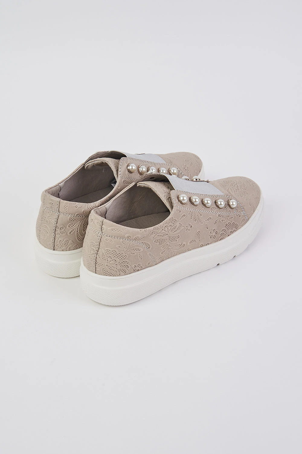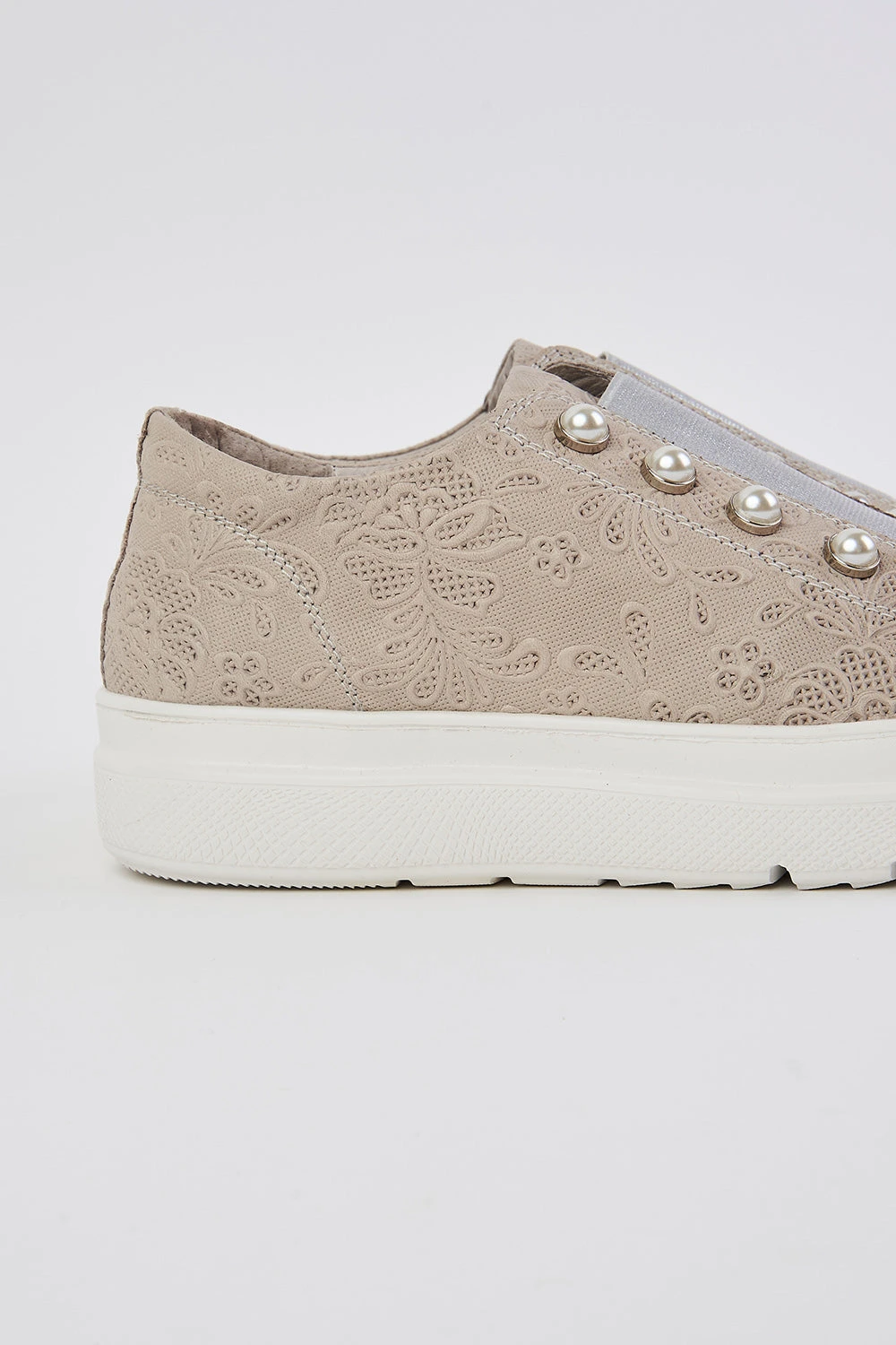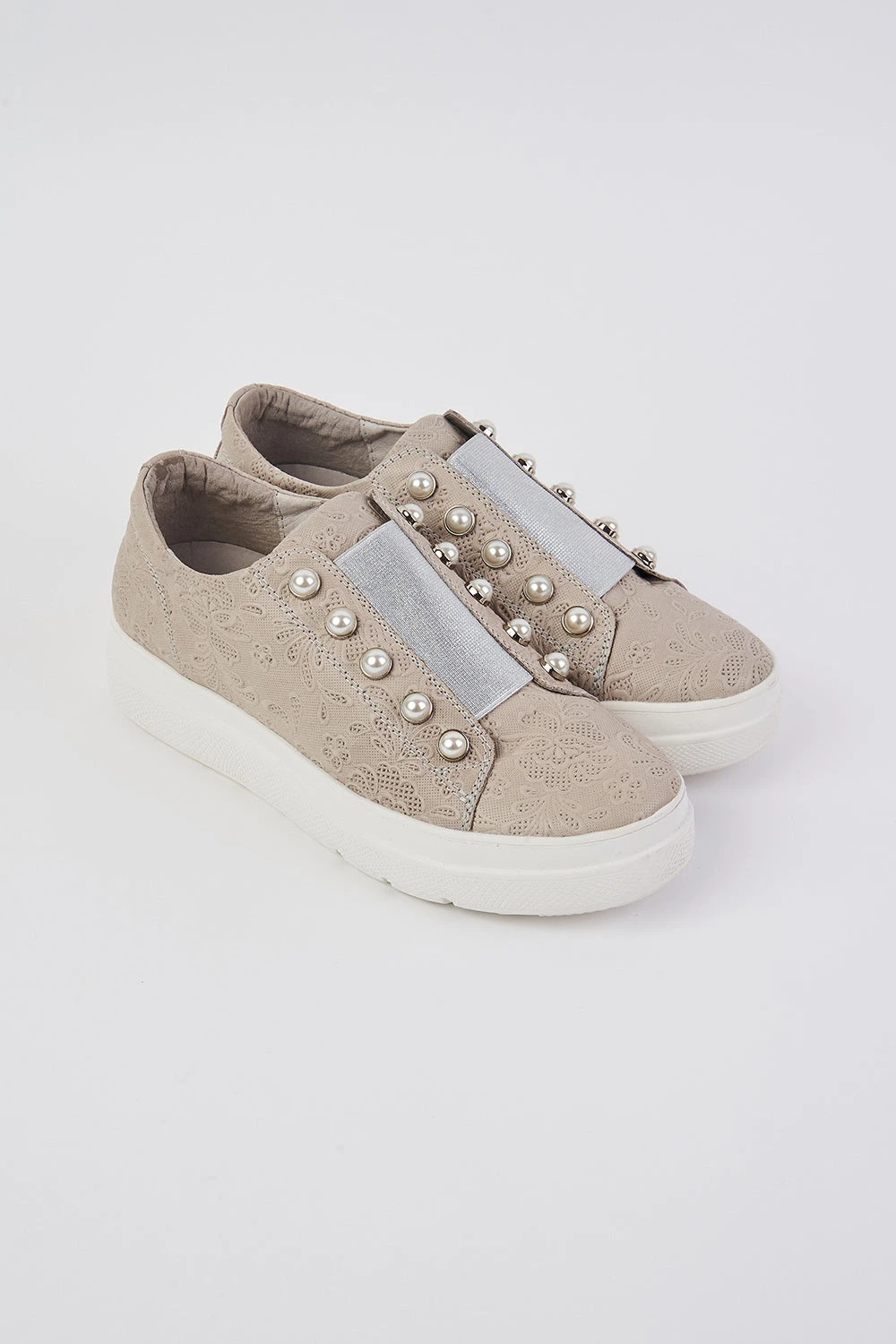 Crafted from leather with an embossed lace-inspired design, this is an ultra-light street-style sneaker with added pizzaz. Stand out from the crowd with the glass pearl embellishments and metallic silver elastic strap. Easy to pull on and go, there is also a removable foot support, making sliding orthotics into this sneaker super simple.