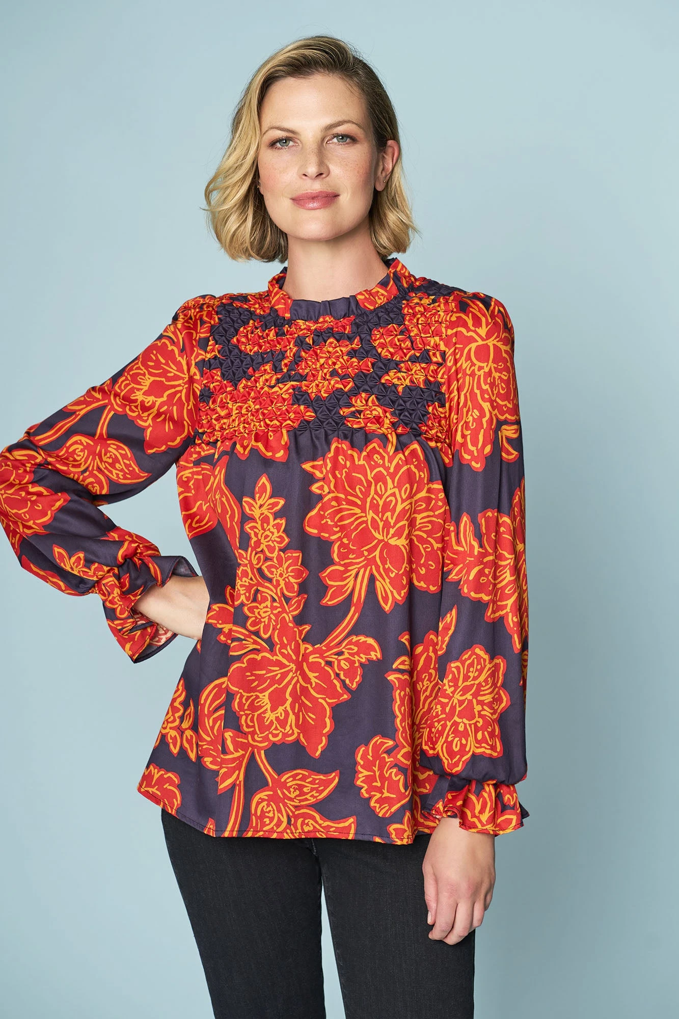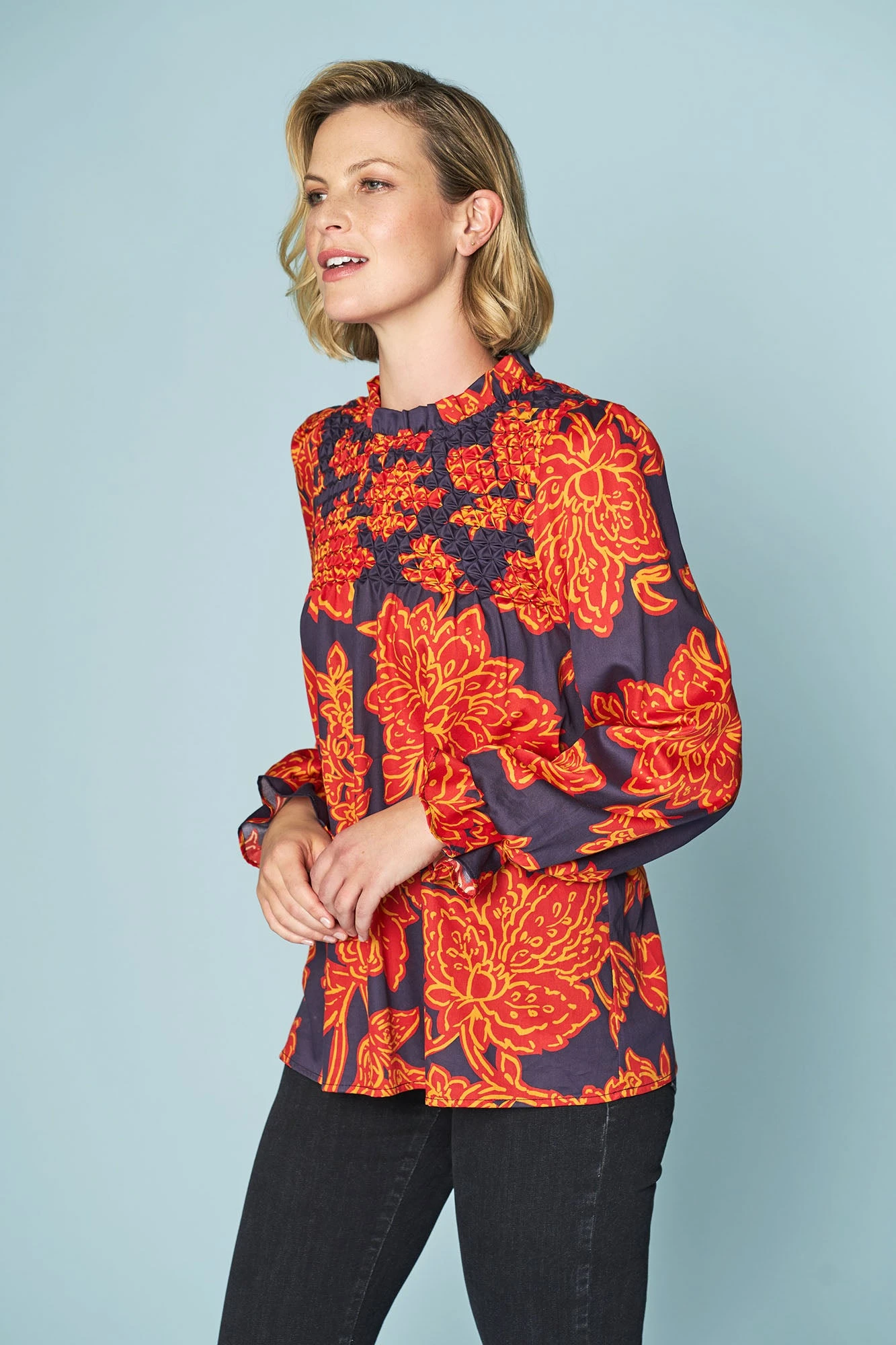 This gorgeous Smocked Cotton Printed Top is a beautiful statement piece of our Boulevard Saint-Germain collection. The boulevard’s surrounding upholstery stores have inspired this stunning top complete with hand smocking and a rich colour palette. It’s a comfortable top with a full-length puff sleeve and sweet frill detailing. To complete the look, slip on a pair of our signature Bengajean® and our Seine Double Zip Ankle Boot.