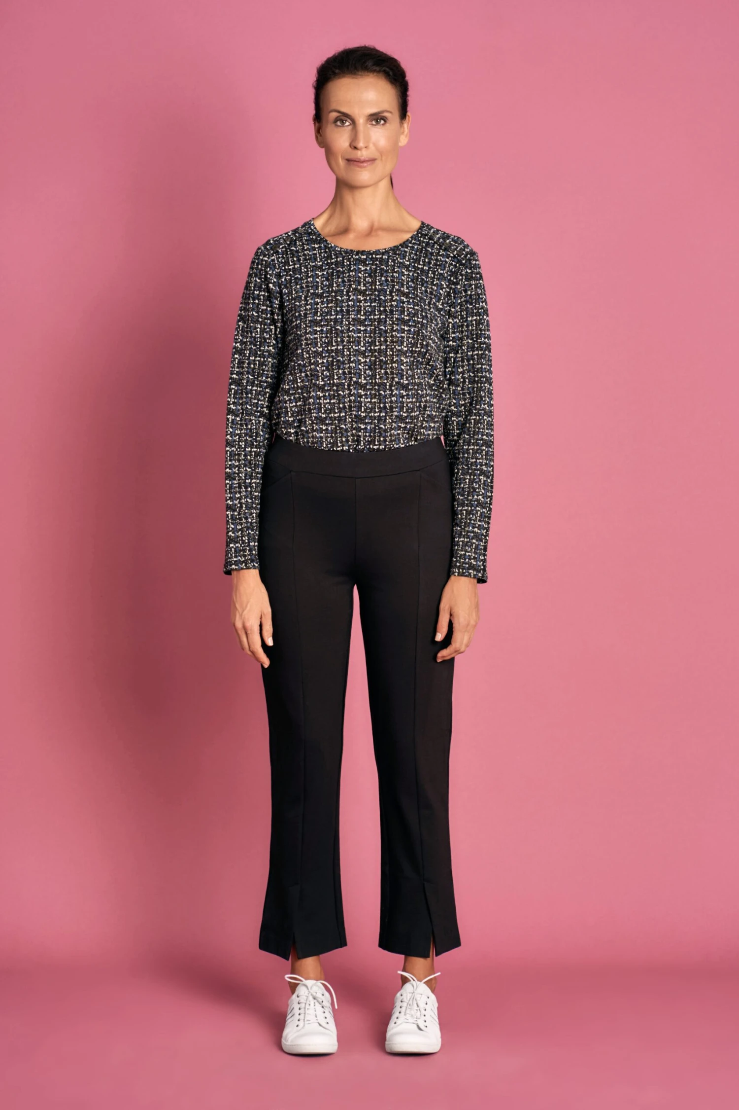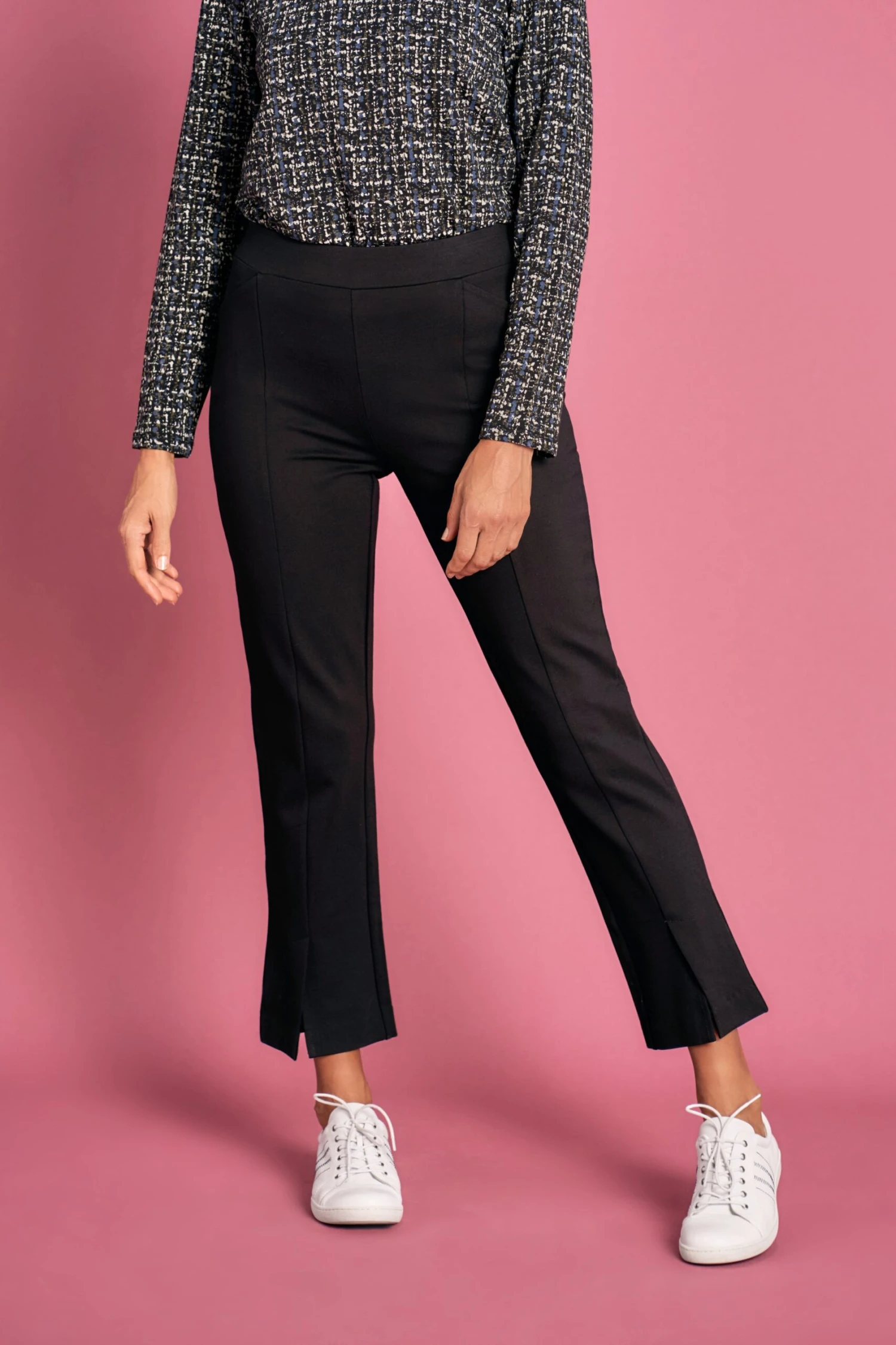 A staple of our Gustave Courbet collection, these black, front split hem, 7/8 pants will add a hint of drama to any outfit. Designed with all-day comfort in mind, these pants are a pull-on style, feature an elasticated waist and are crafted from stretch ponte fabric which moulds to any body shape to create a smooth, streamlined silhouette. For a sophisticated look, add our Frill Trim Blouse and Printed Ponte Blazer.