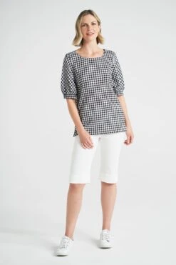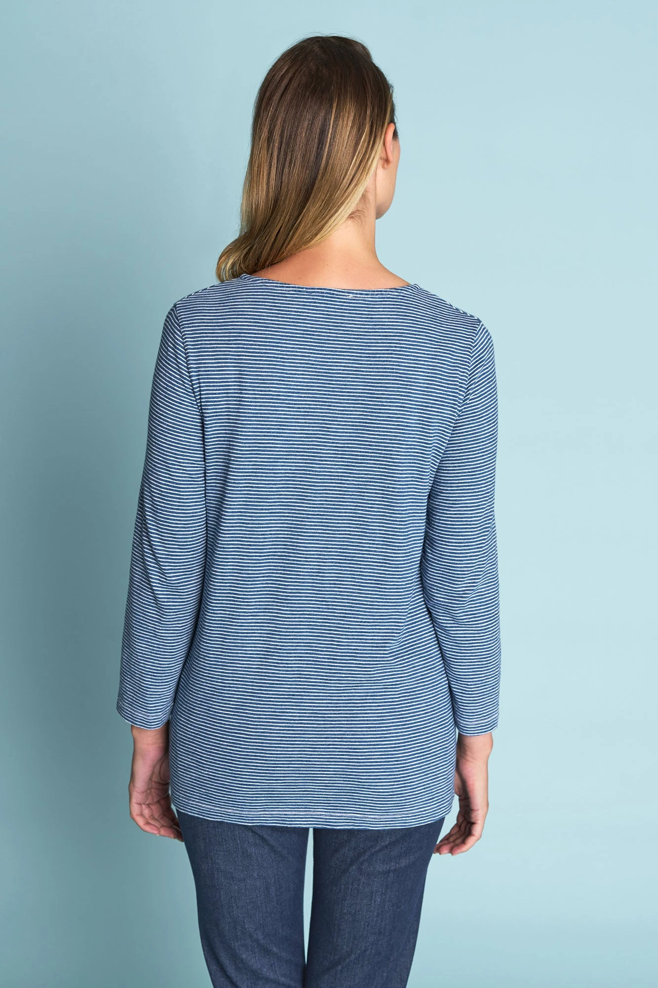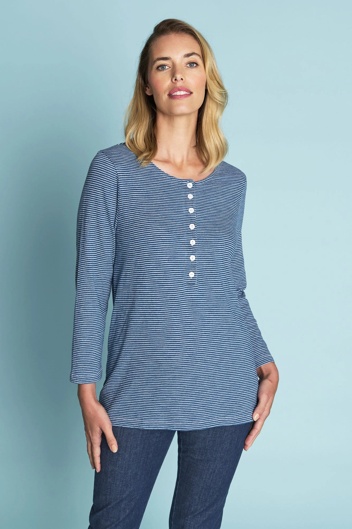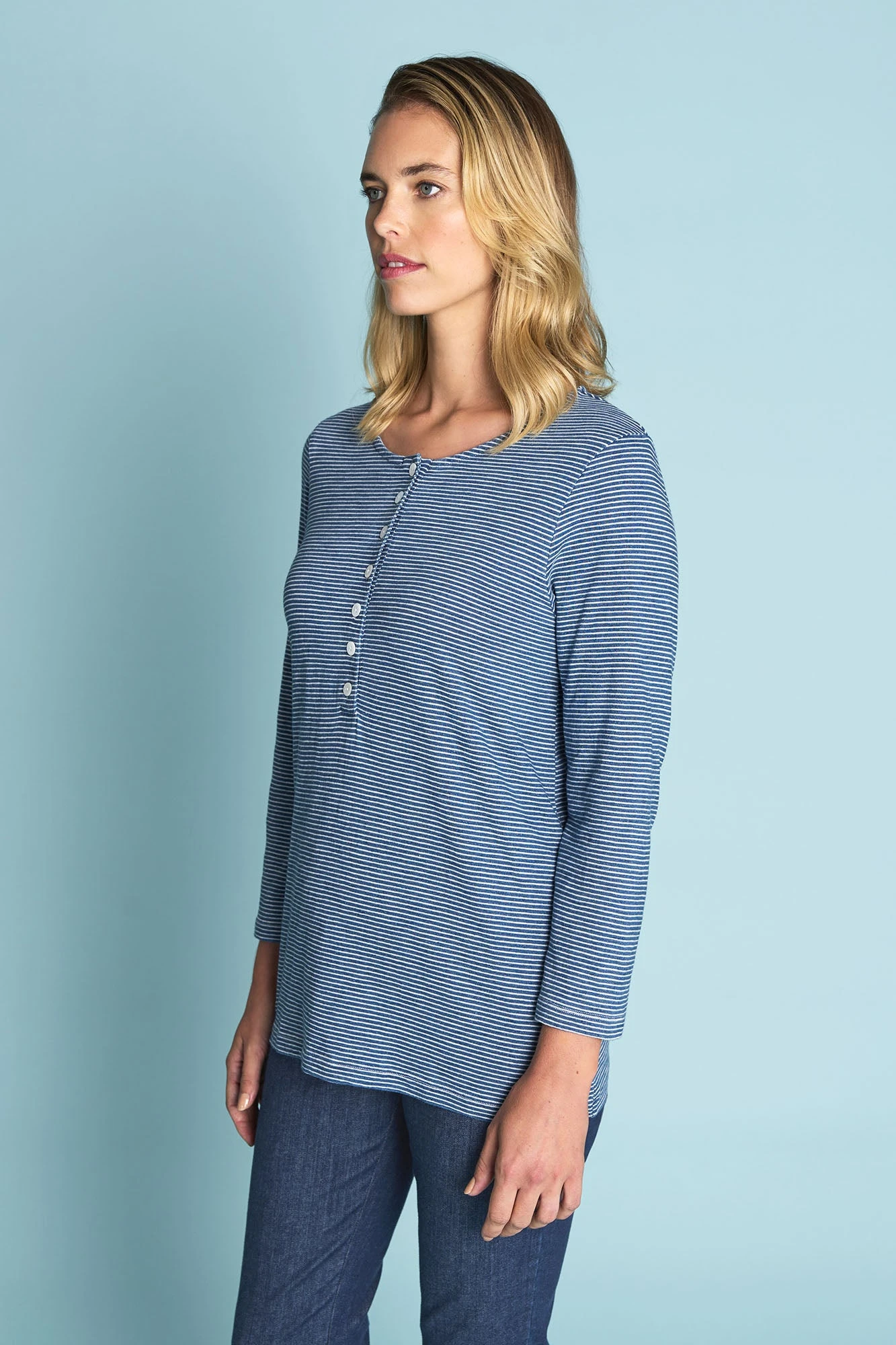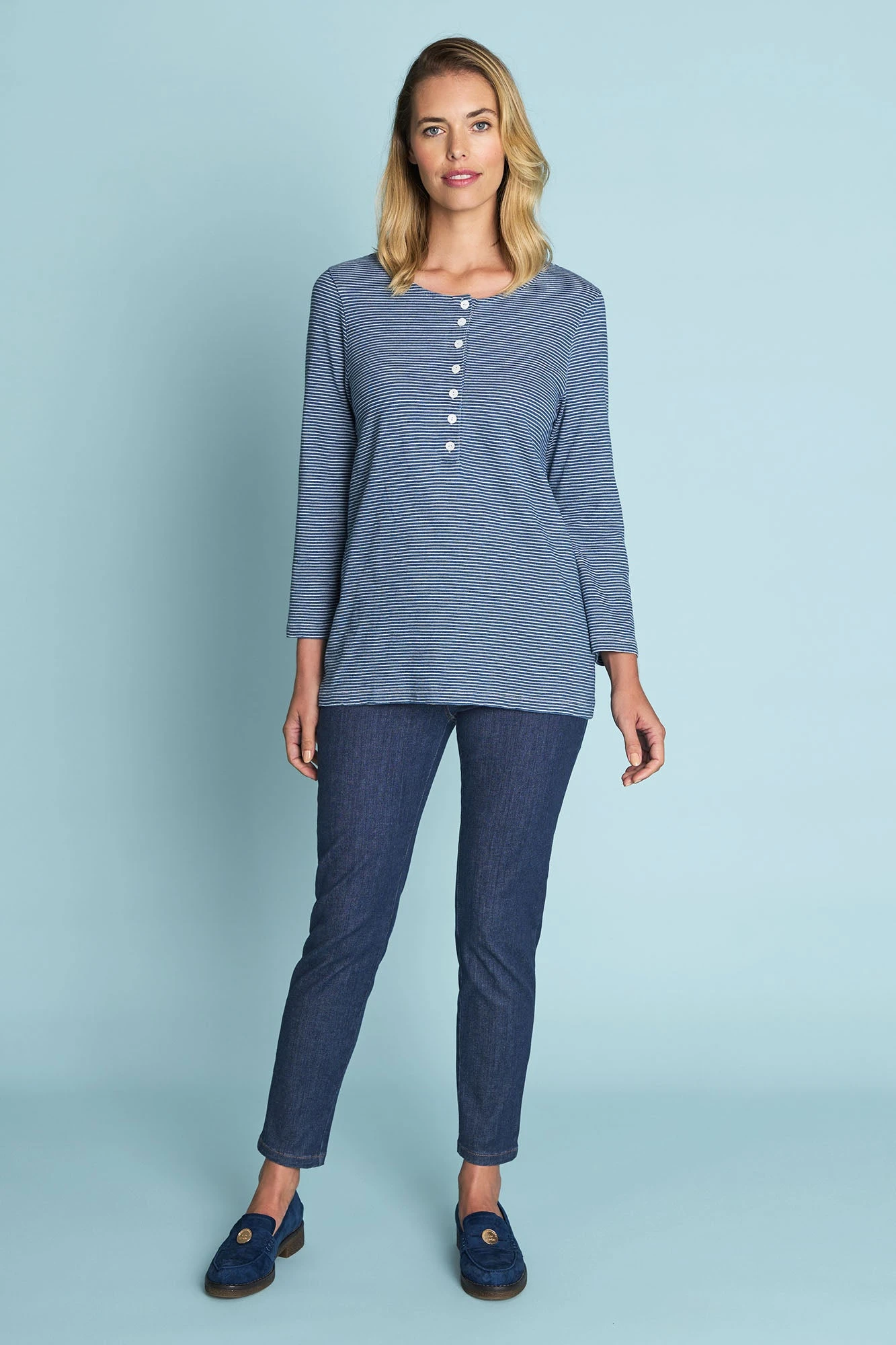 Nothing says Parisienne like a chic stripe. Featuring a yarn dyed stripe in White and Indigo, our Stripe Henley T-Shirt offers a front half button placket with Blue Illusion engraved shell buttons, a comfortable relaxed fit and 3/4 sleeve. Wear it with our signature Bengajean® for a casual French-inspired look.