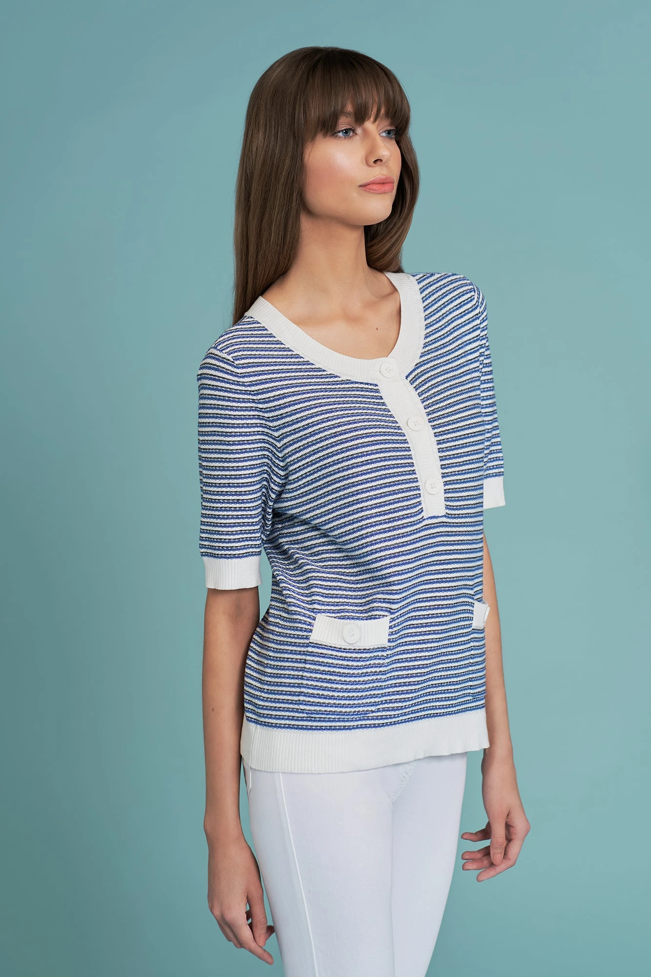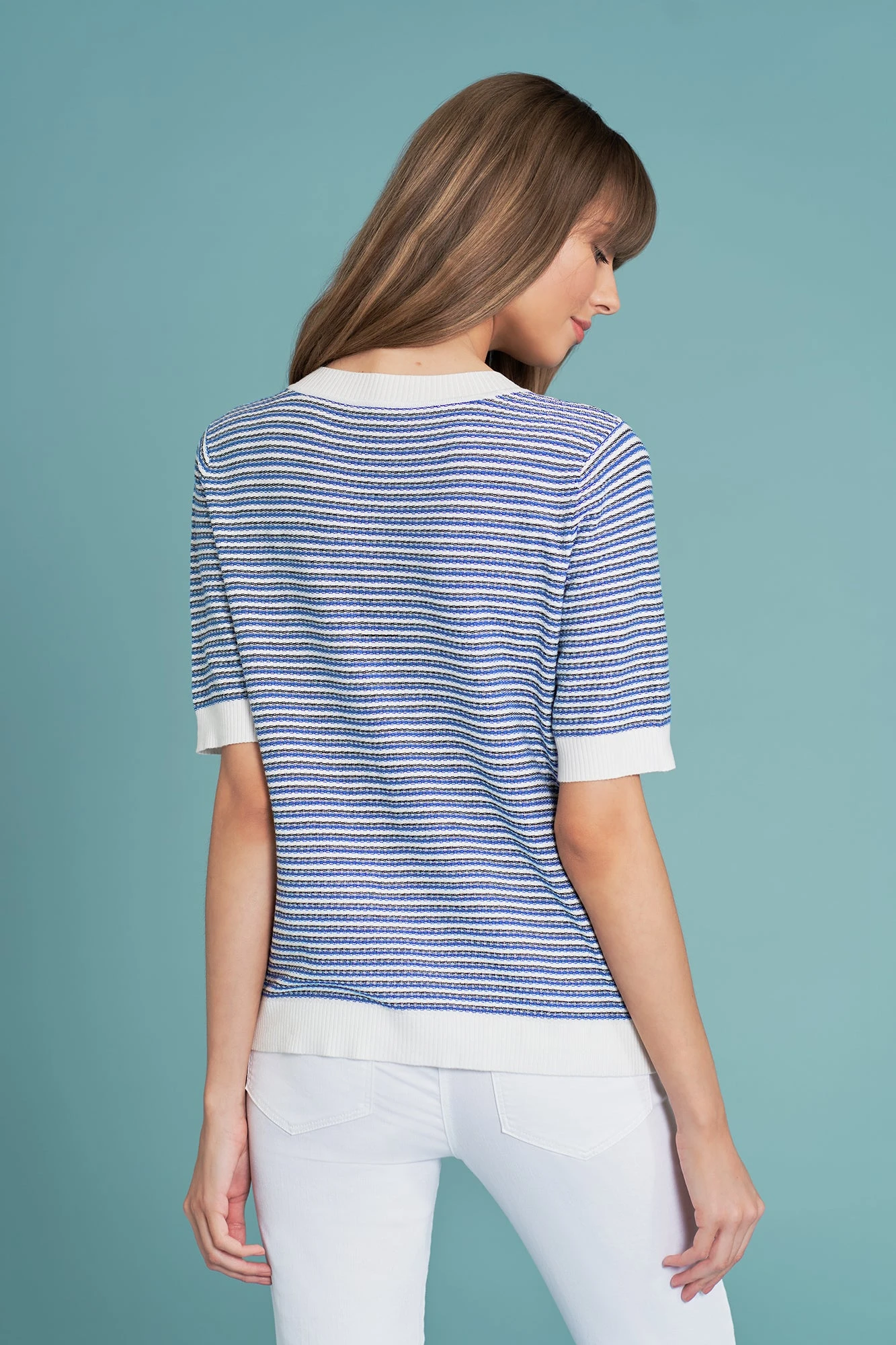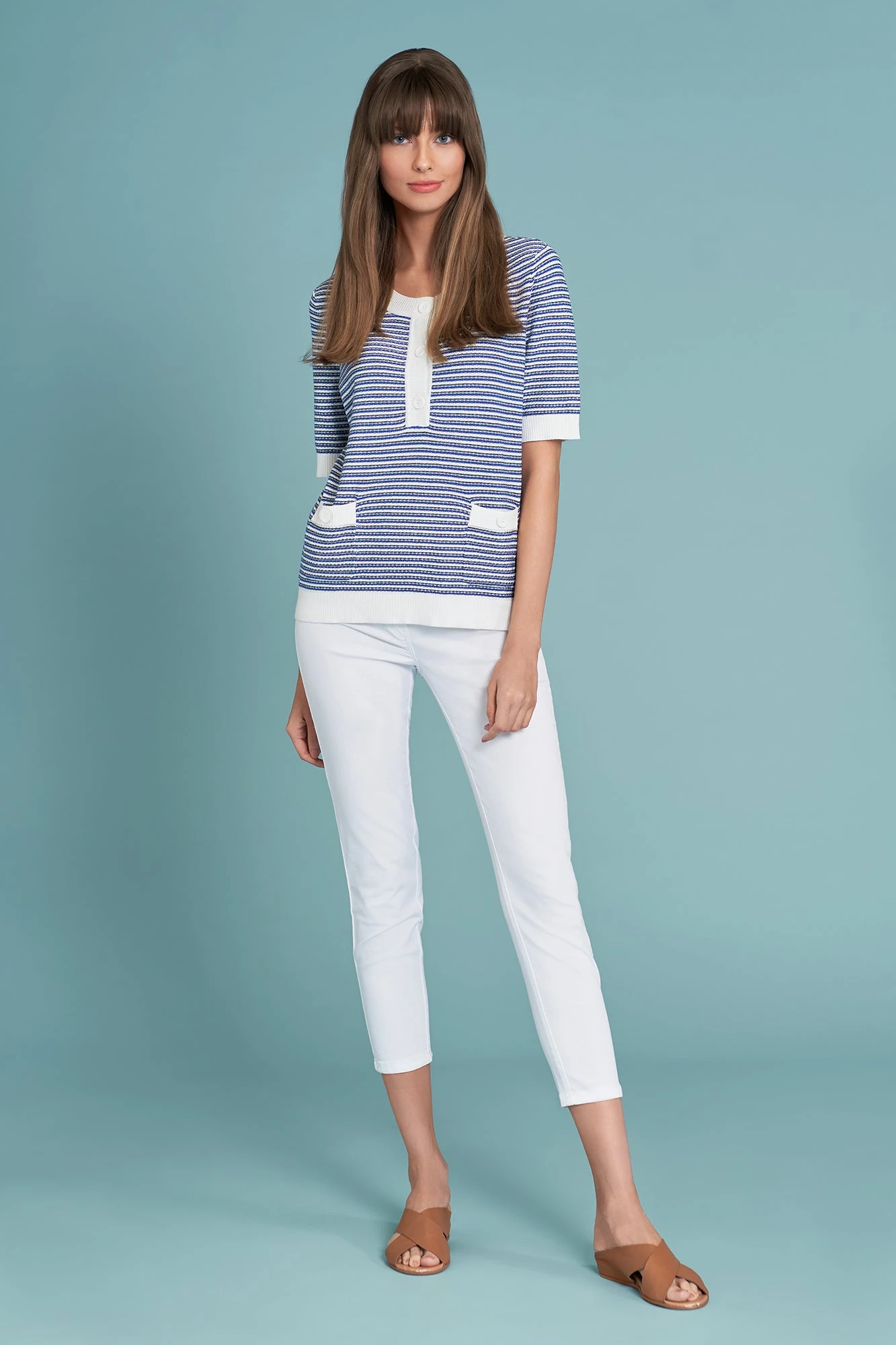 Nautical-inspired French style is on show with our Texture Stripe Knit. Part of our Nice collection, this slim fit knit features a blue, white and black stripe and fun front pockets. Wear this textured knit with our ever-versatile Waist Tab Linen Pant.