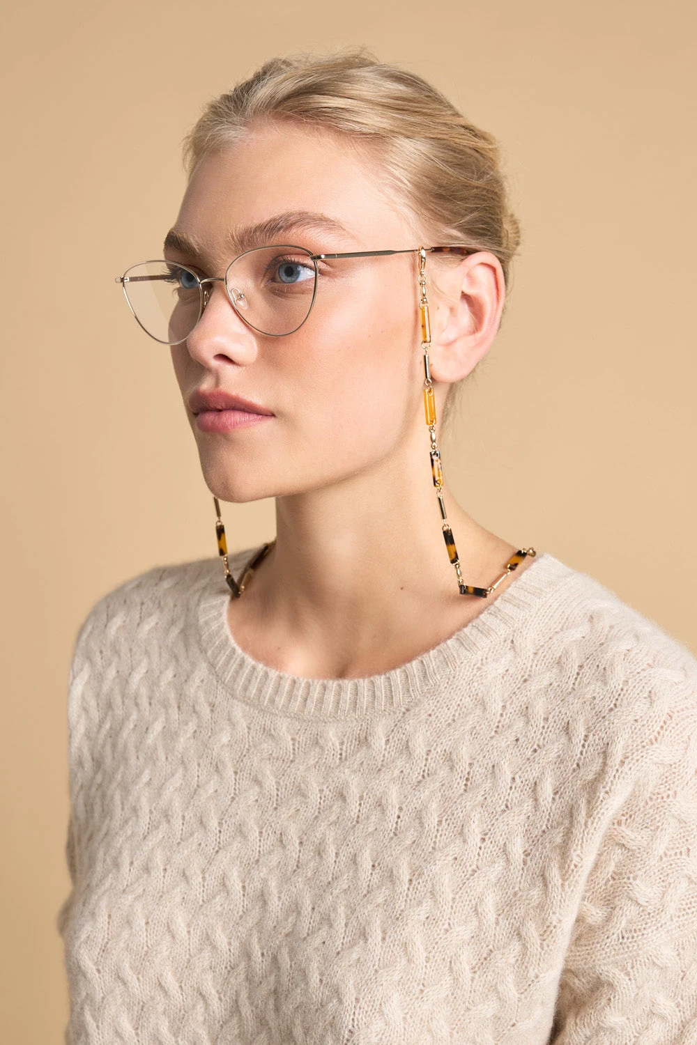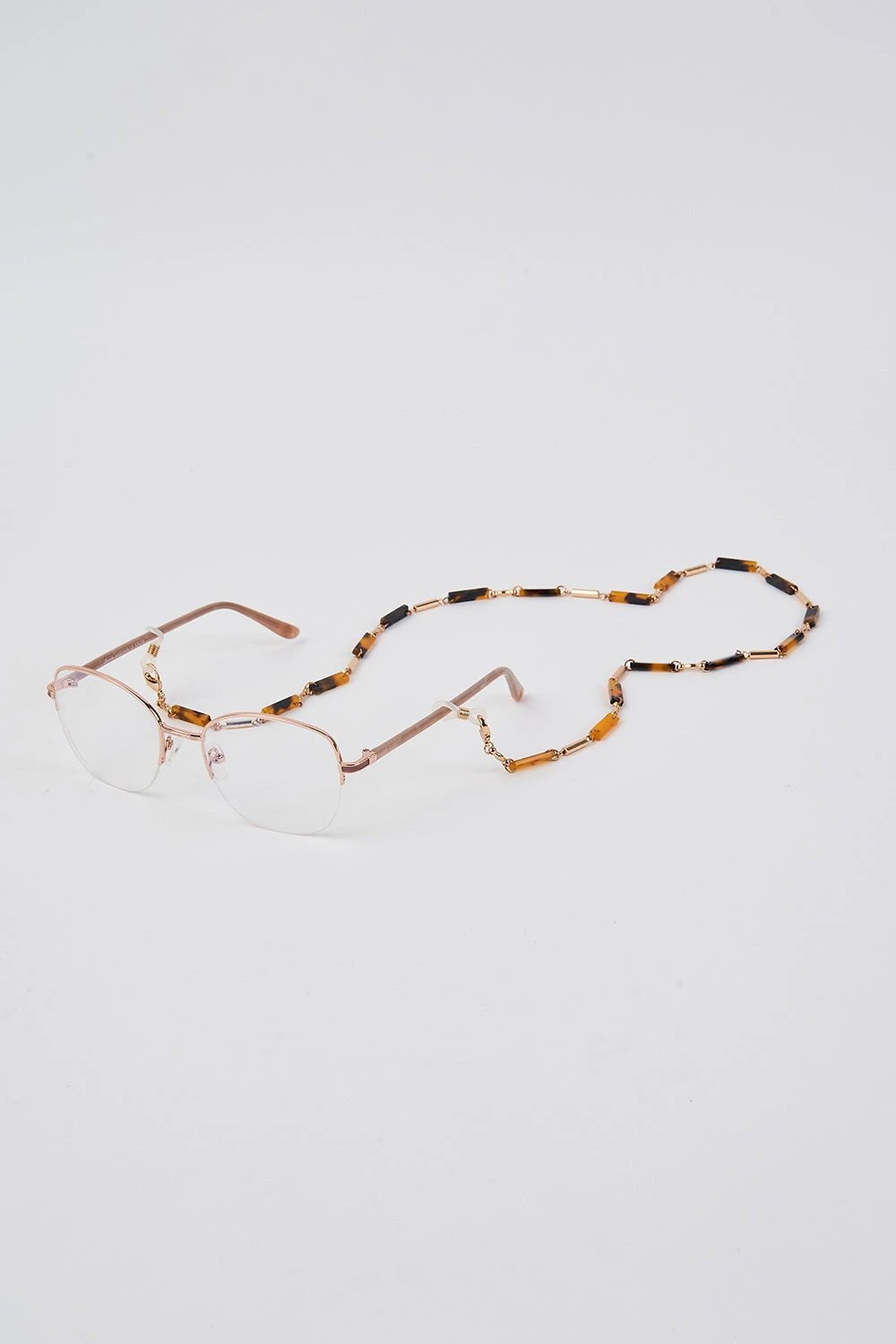 An instant, decorative update to your glasses or sunglasses is now possible with our elegant Tortoise Shell Glasses Chain. A lightweight chain featuring a combination of rectangular tortoiseshell style beads paired with gold bar links, easily adjust the rubber attachments to suit your frames and never misplace your glasses again!
