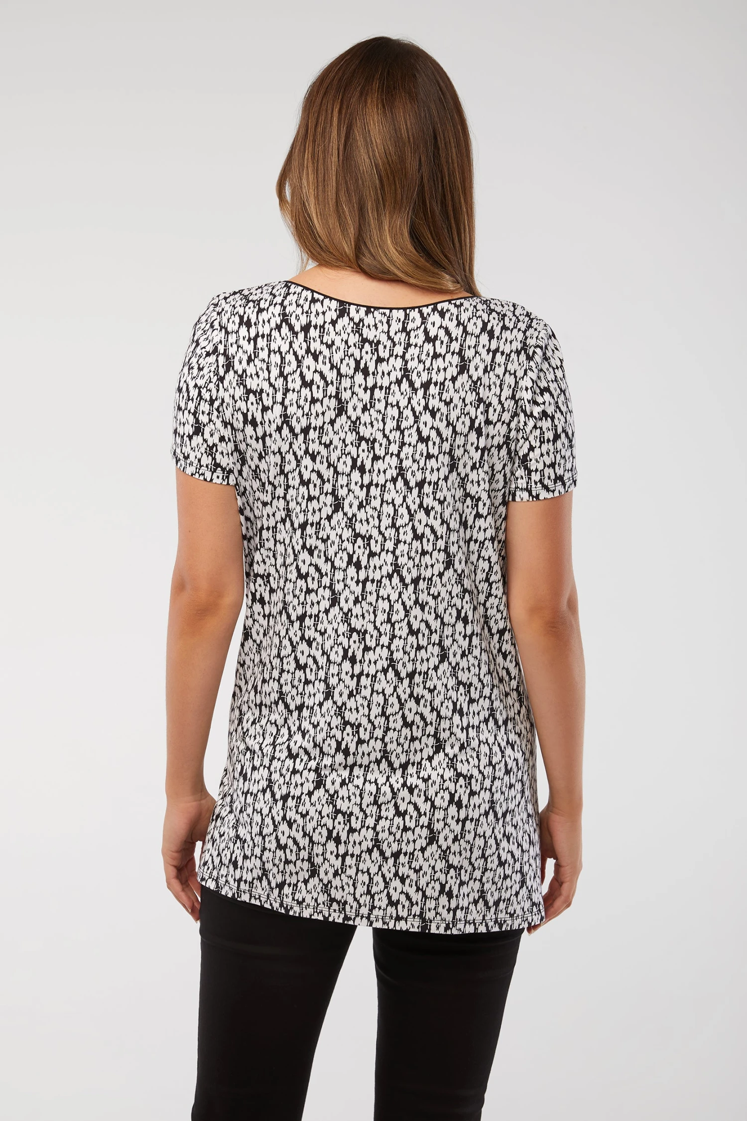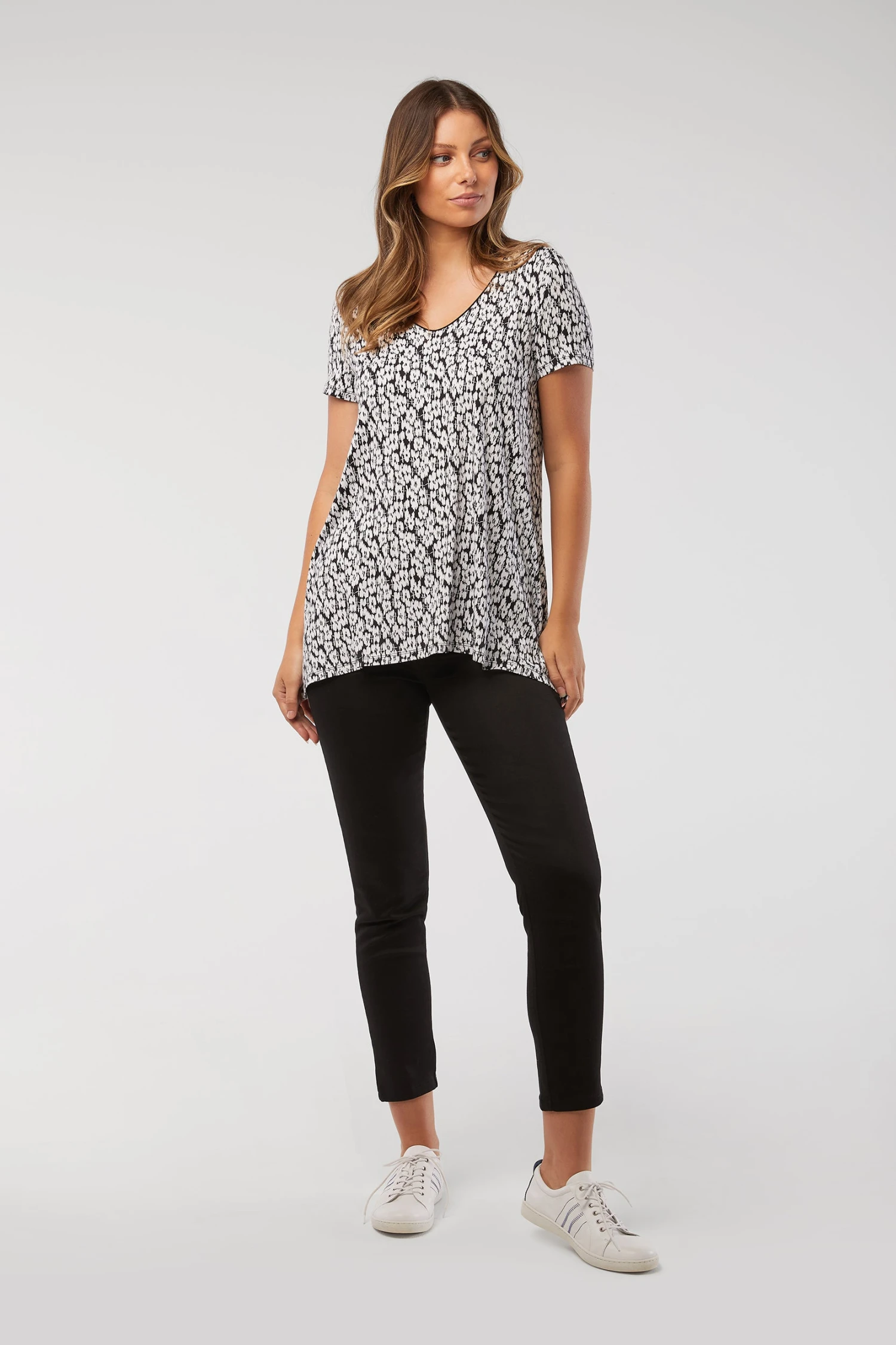 This easy-to-wear tee is now available in fleurs monochrome print. Breezy and lightweight, the trapeze shape hem allows for a relaxed and flattering fit. Featuring cap sleeves and a rounded v-neck, this teams beautifully with a chunky coloured necklace for extra lift.
