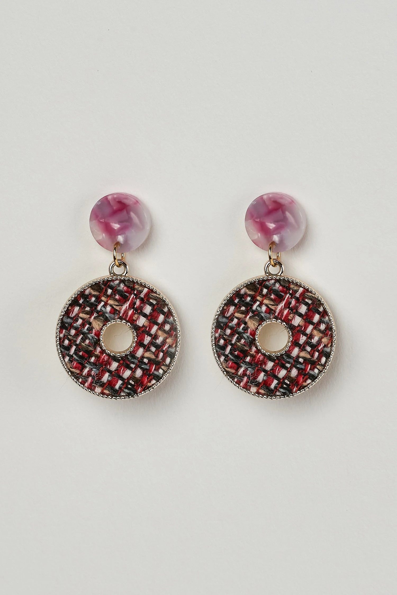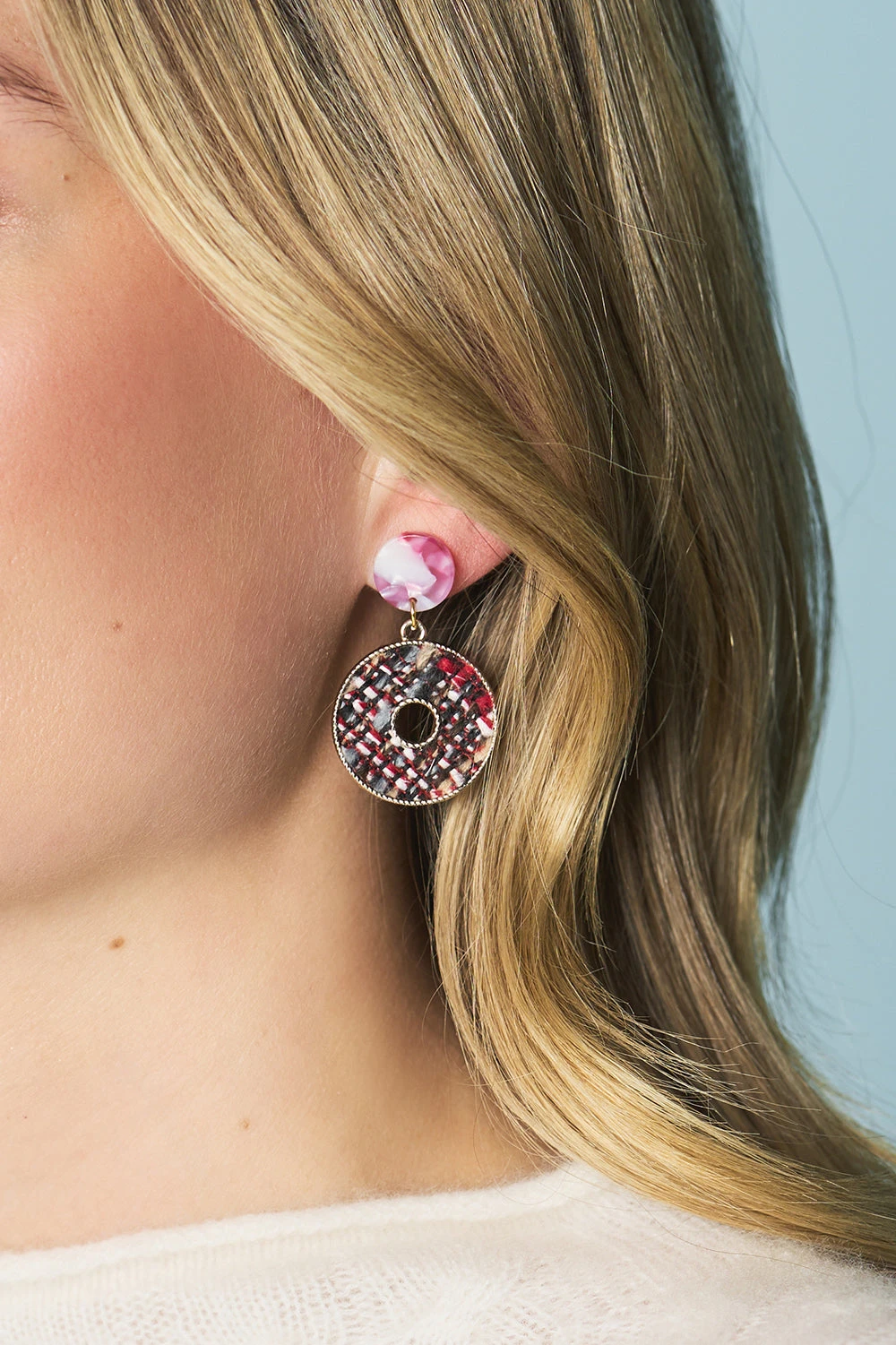 These lightweight, textured Tweed Drop Earrings are a fun mix of corporate and modern designs. With a resin-inspired base paired with a donut drop featuring the Peony Tweed of our Rue L’Abreuvoir collection, ce bijou is a lovely accessory to our matching Tweed Coat or skirt.