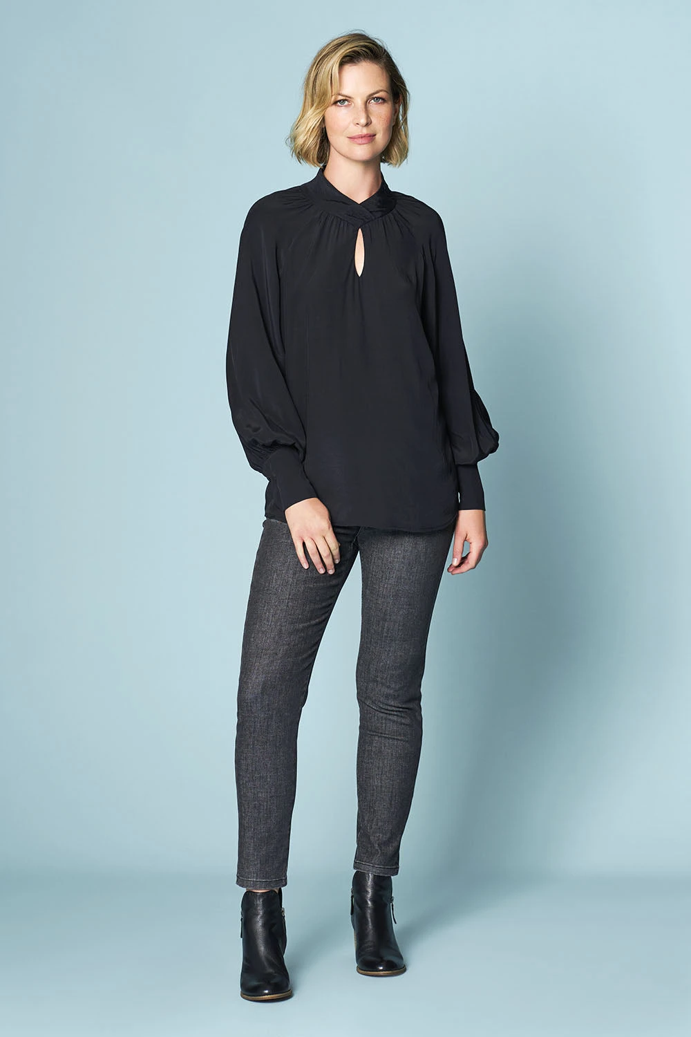 Glamour takes on a new form with our Twist Neck Flounce Top. A dressy piece designed to flatter in all the right places, it features a crossover collar band and keyhole detail as well as a full-length blouson sleeve. Crafted from a silky viscose fabric with a slight lustre, step out in a style that’s not to be missed!