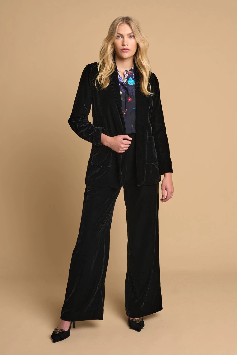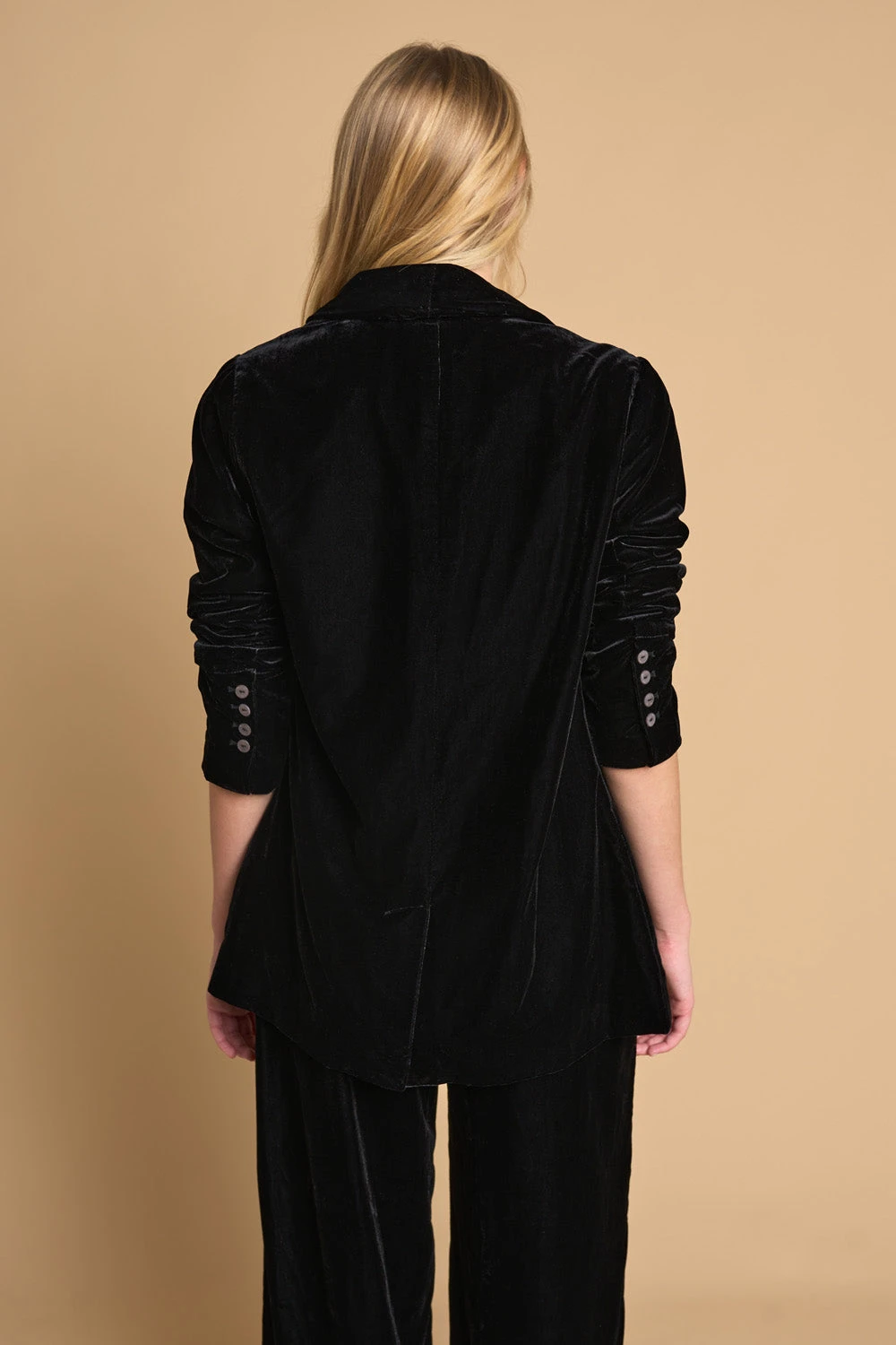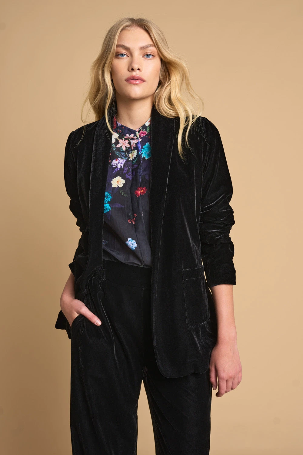 This fabulous blazer can be worn by itself or as a duo with our Velvet Straight Leg Pant to create a statement suit. With a flattering long-line silhouette, this blazer also features a shawl collar and front patch pockets. Crafted from sumptuous Black velvet with a lovely soft hand feel, add a pop of colour with our Silk Cotton Shirt.