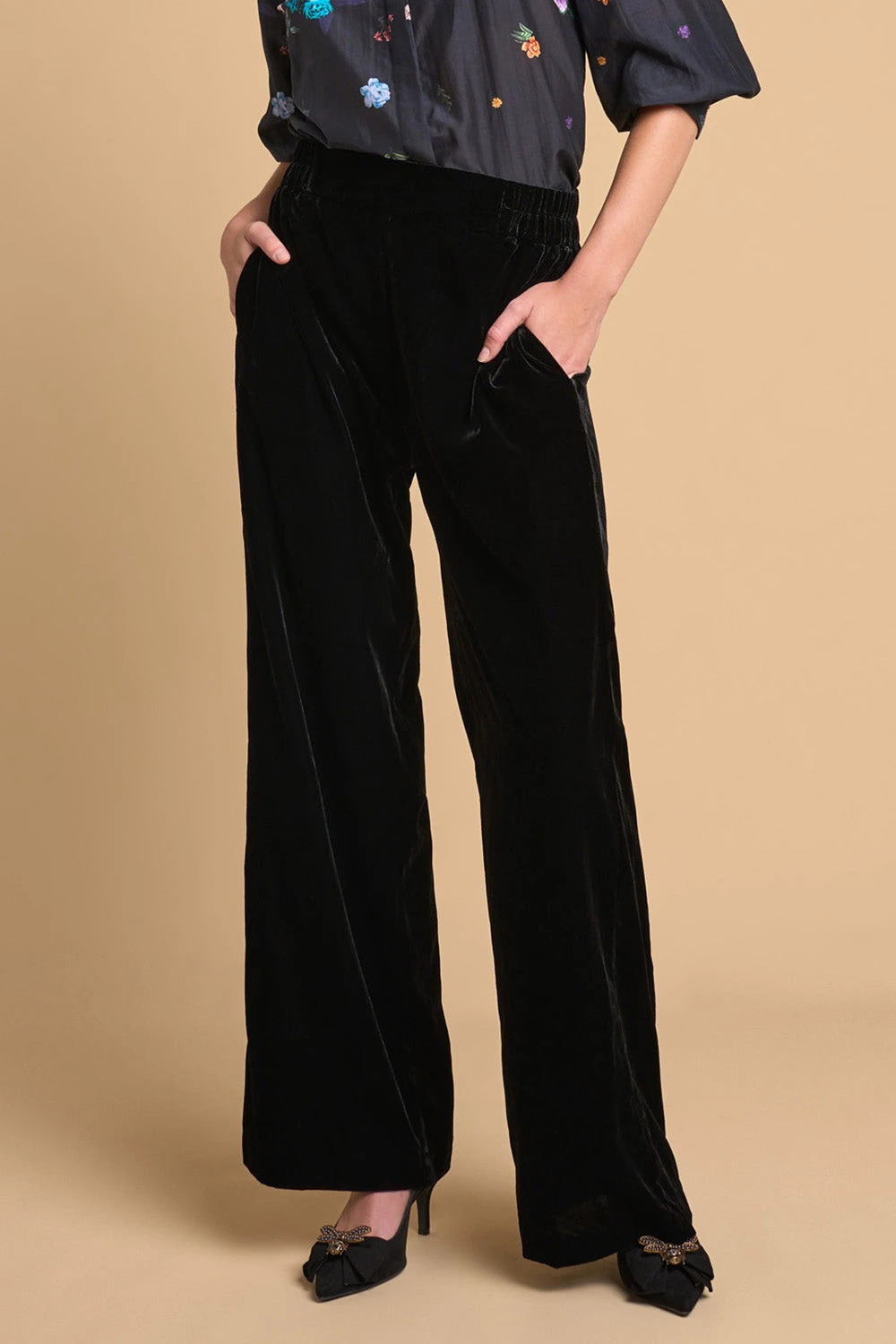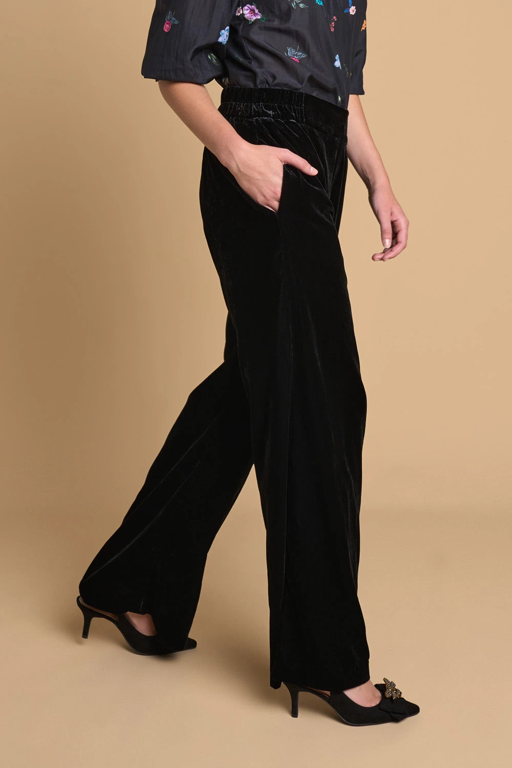 The Velvet Straight Leg Pant offers an easy pull-on style with a flattering and comfortable wide straight leg. A sleek finish is created with the pant’s flat front and elasticated waistband at its back. For a high fashion look, pair this pant with our matching Velvet Blazer, Abbey Black Slingback and your favourite blouse.