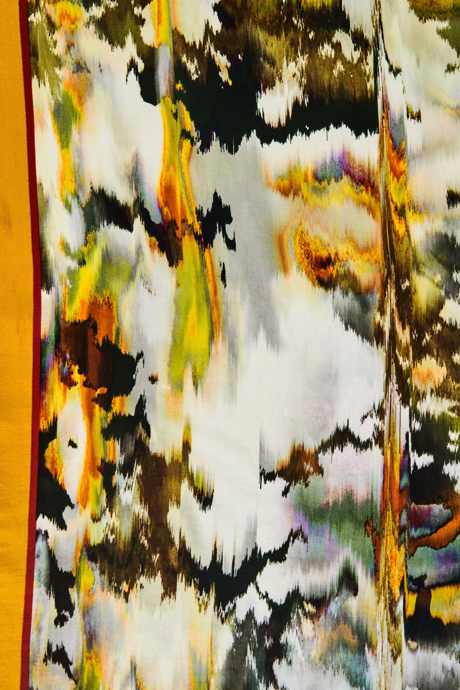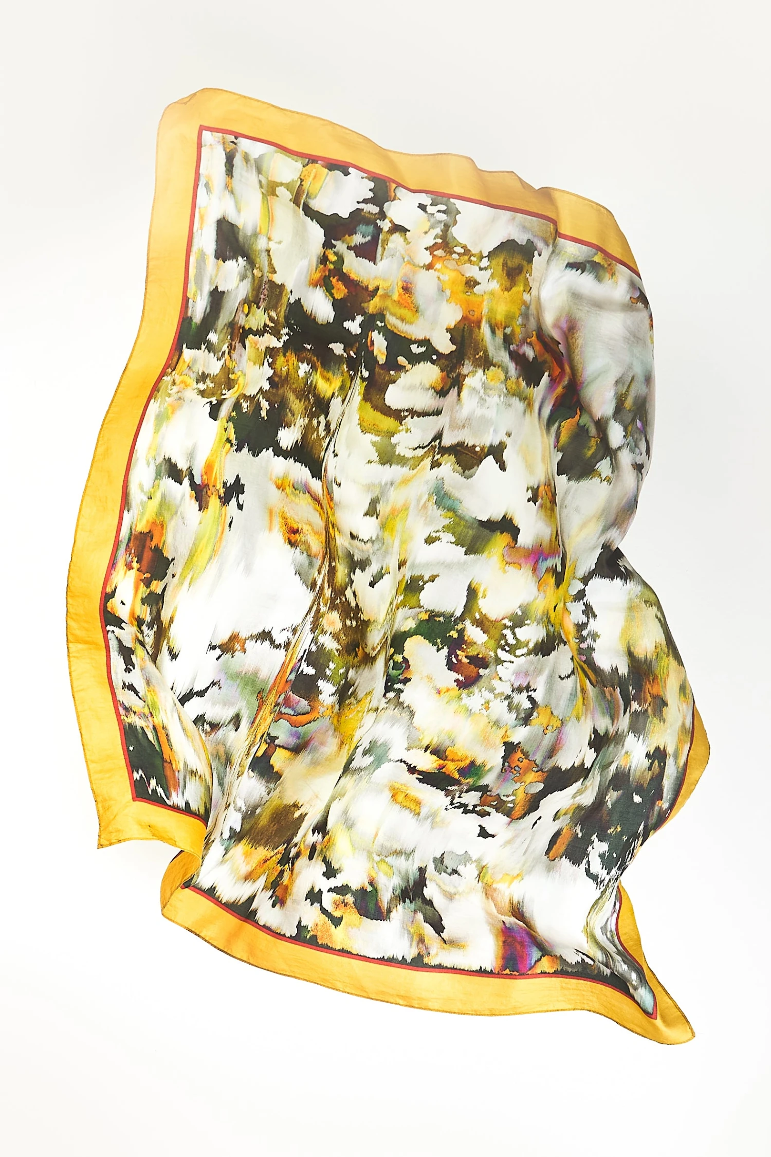 Let your artistic side shine in our Watercolour Silk Scarf. Featuring a vibrant yellow border, this lightweight scarf is crafted from 100% silk and features a charmant abstract watercolour design.