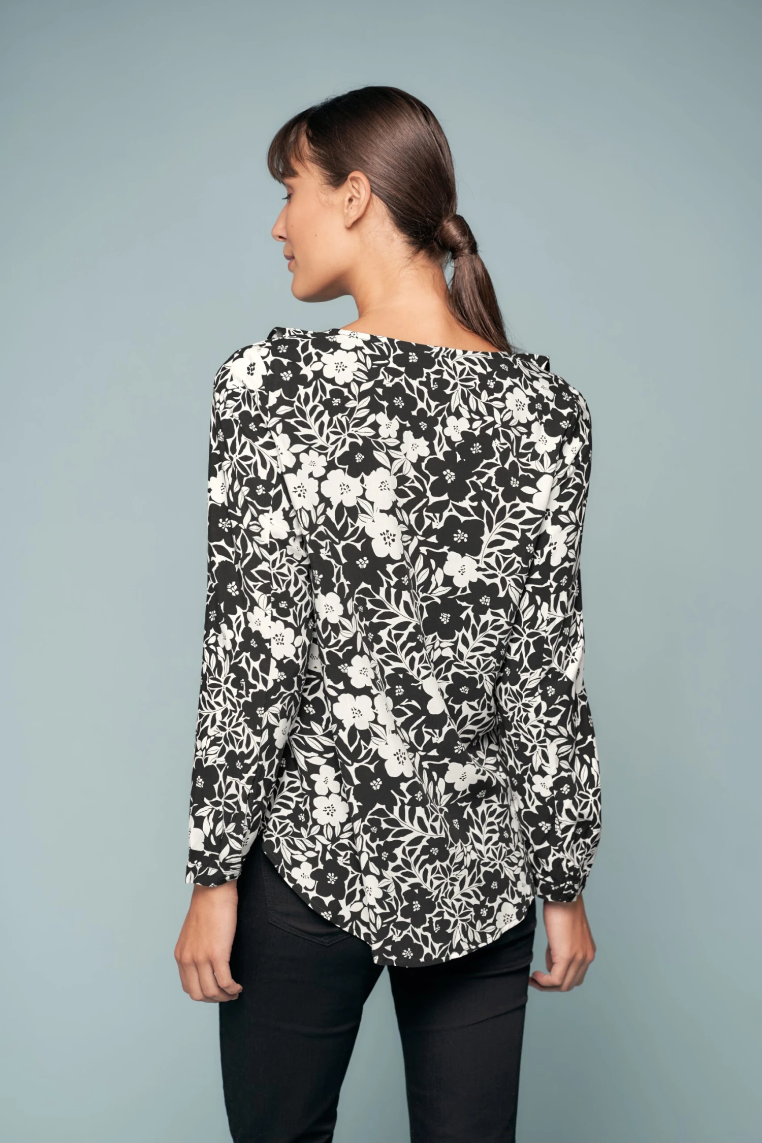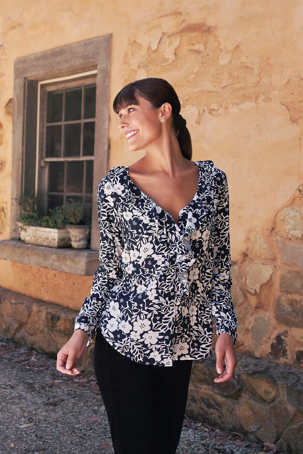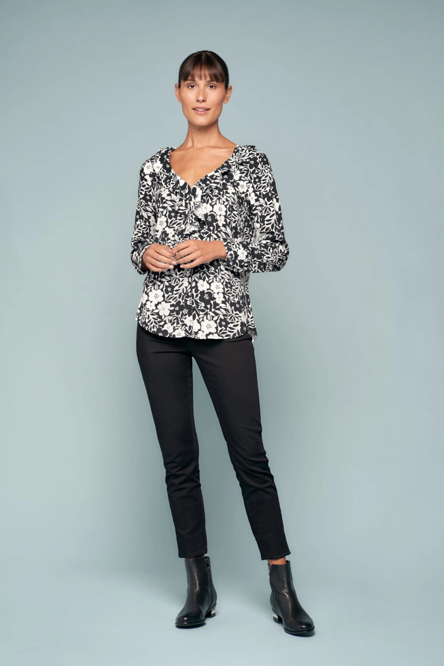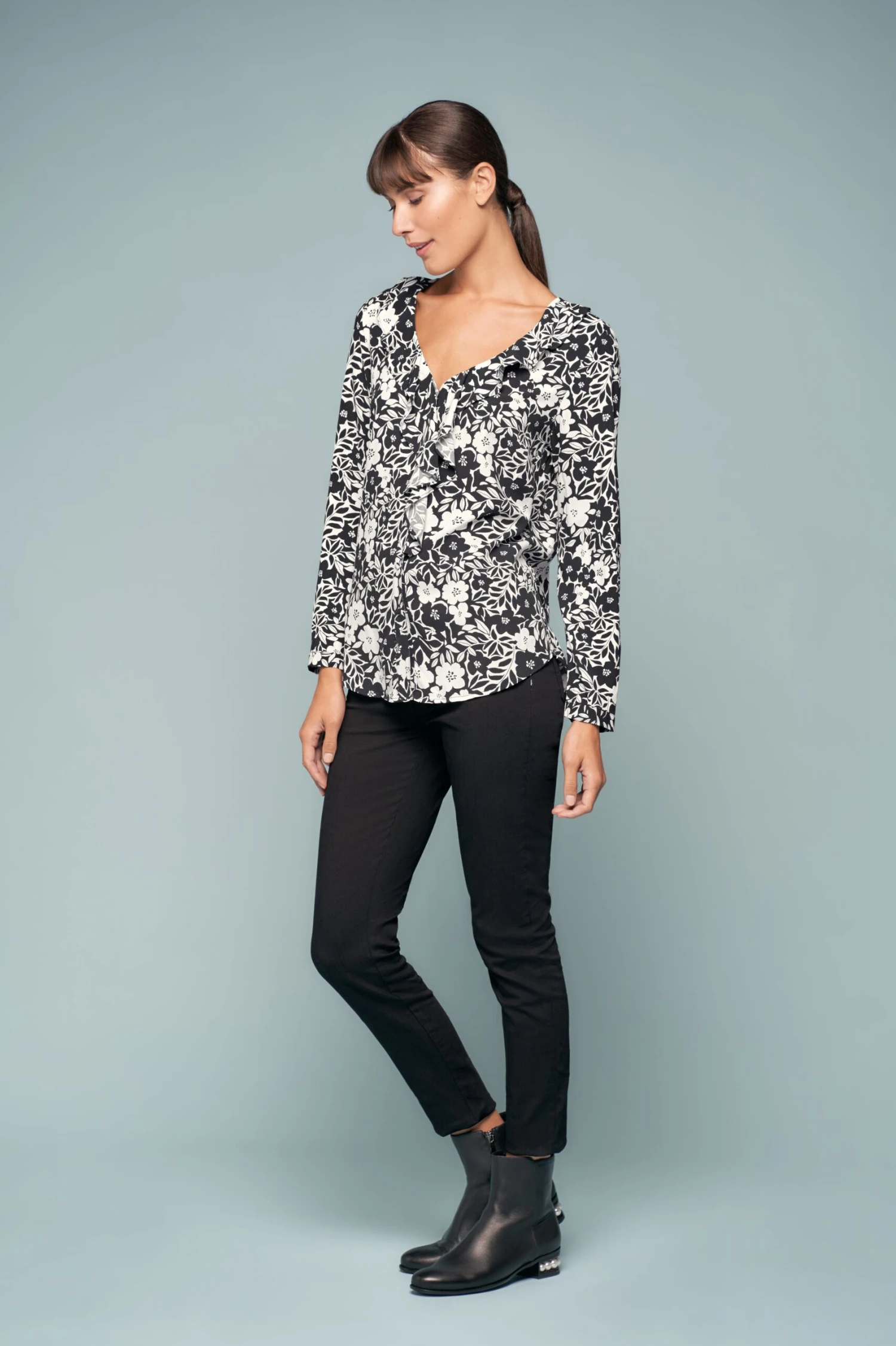 Elegant and eye-catching, this top is part of our new Parc des Ateliers collection and showcases our stunning monochrome floral print. With féminin details such as a waterfall ruffle neckline and cuff button closure, you’ll have this lovely shirt on high rotation. Pair it with our black Bengajean® and Jolie Pearl Heel Boot for enviable style.