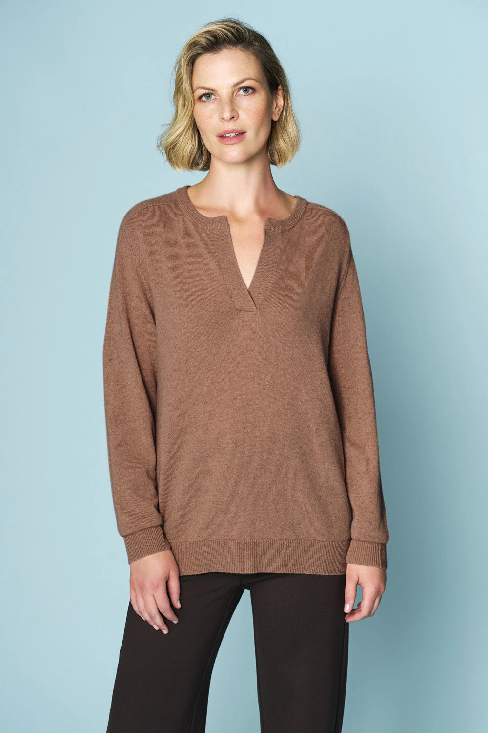 Rug up in our Wool Cashmere Jumper. A great layering piece in a neutral Camel colour, this jumper can easily be dressed up or down with your base and accessories. Offering a simple notched overlapped collar and pointelle detailing, this is subtle winter style at its best.